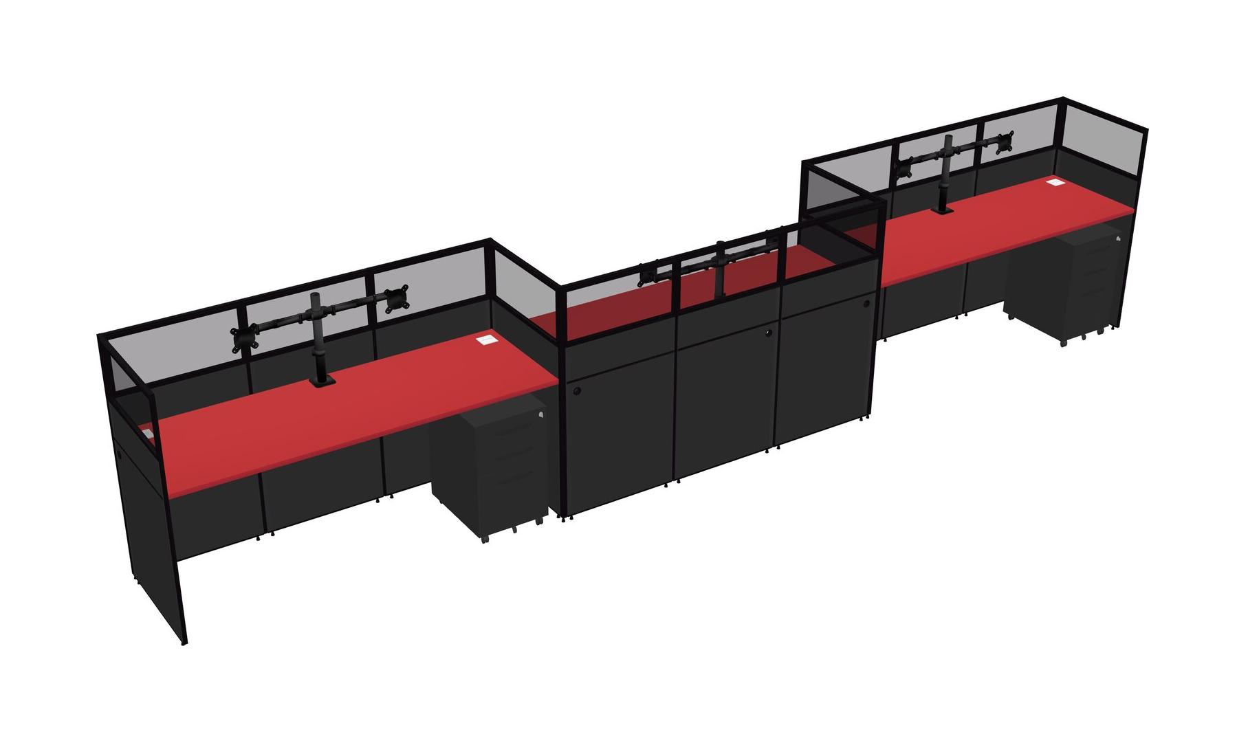 Prism Red Rectangular Cubicle Workstations For 3 - Zigzag Formation + Black Metal Mobile Drawers