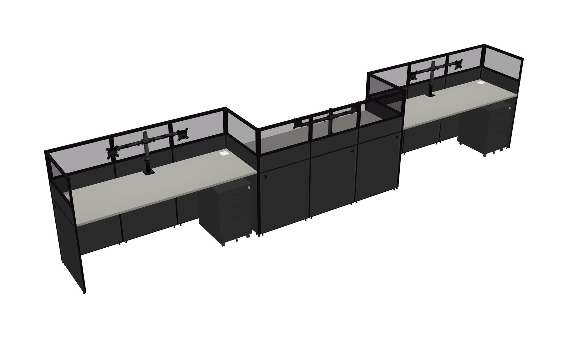 Grey Shadows Rectangular Cubicle Workstations For 3 - Zigzag Formation + Black Metal Mobile Drawers