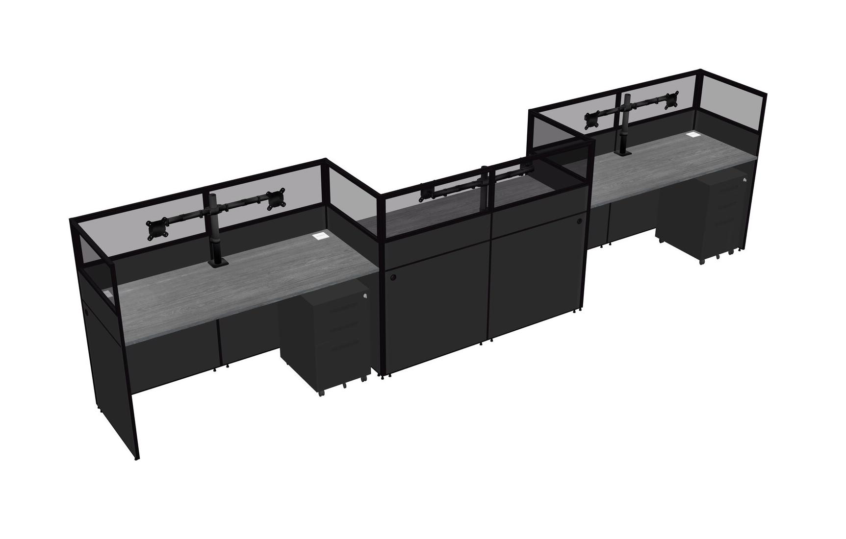 Grey Rectangular Cubicle Workstations For 3 - Zigzag Formation + Black Metal Mobile Drawers