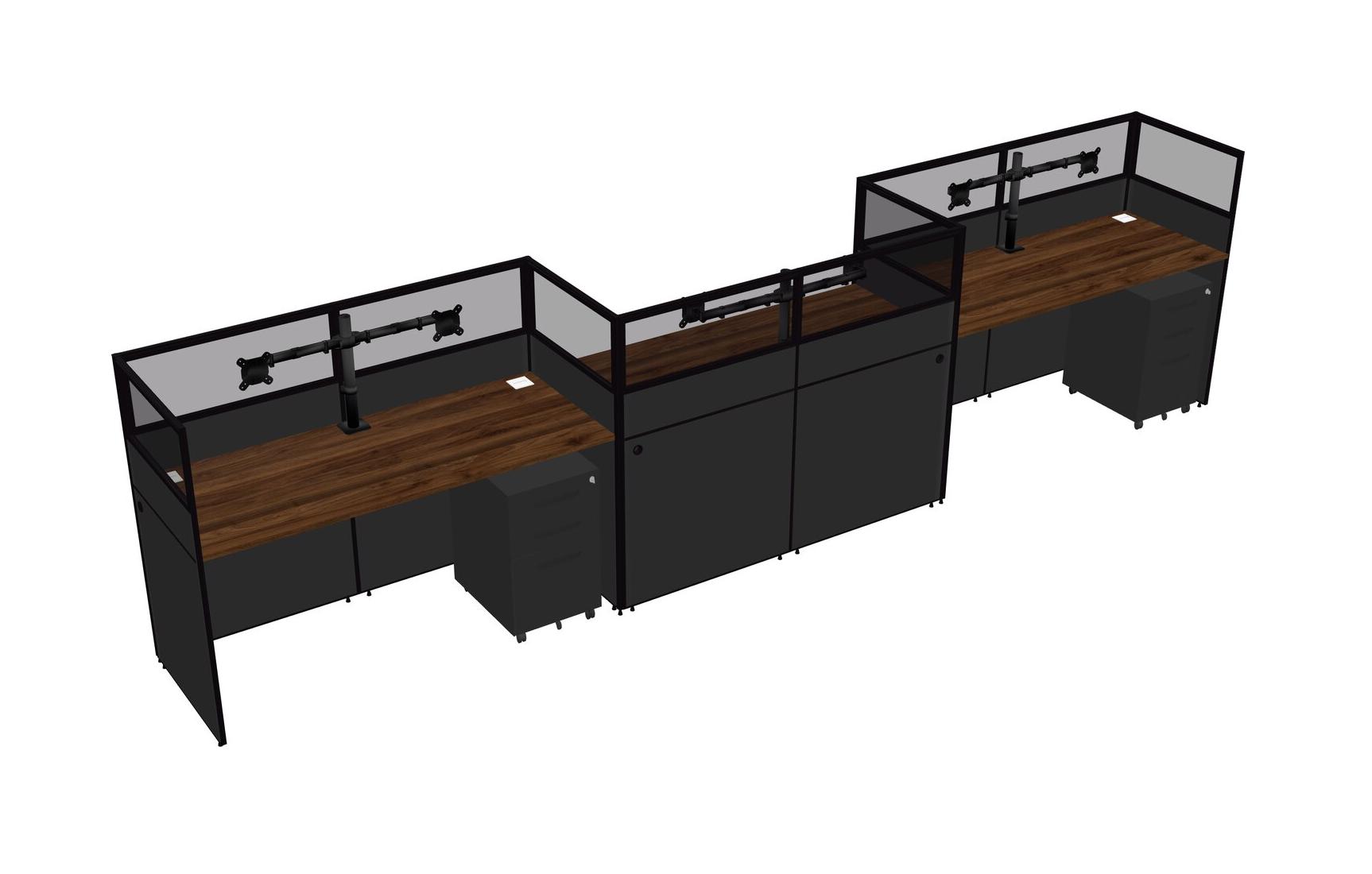 Columbia Walnut Rectangular Cubicle Workstations For 3 - Zigzag Formation + Black Metal Mobile Drawers