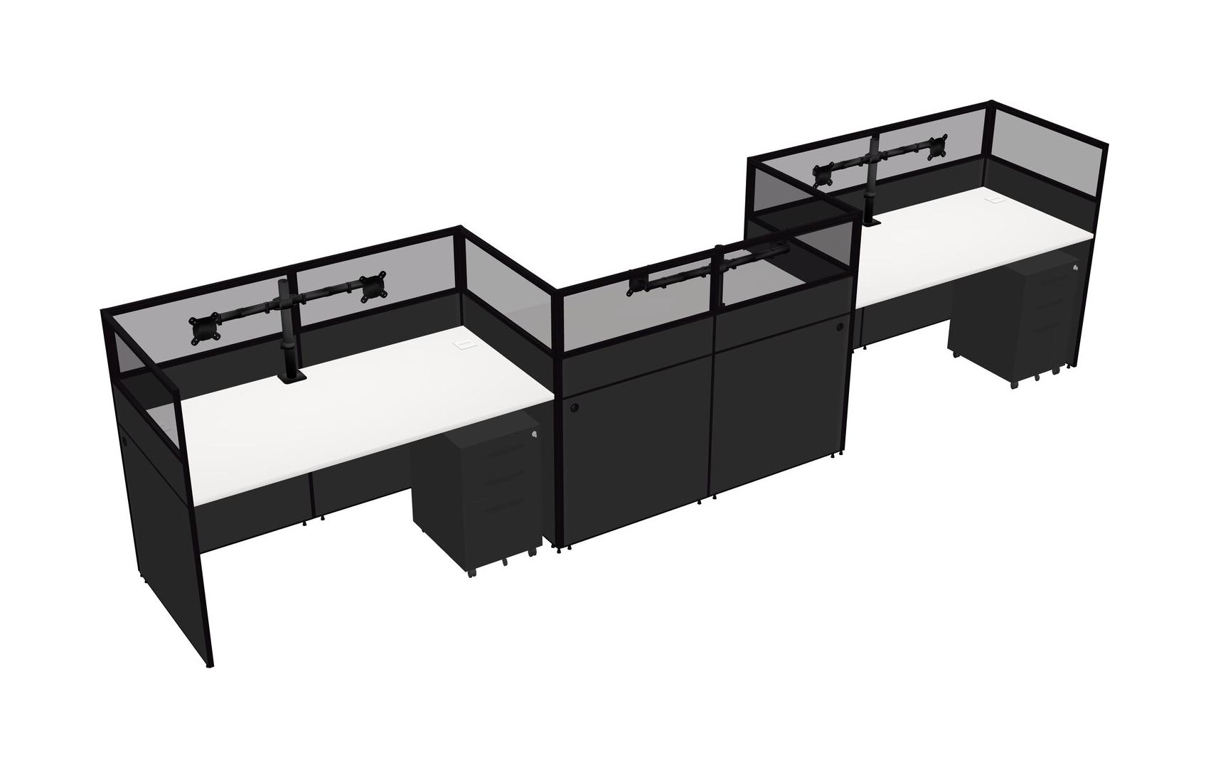 White Rectangular Cubicle Workstations For 3 - Zigzag Formation + Black Metal Mobile Drawers
