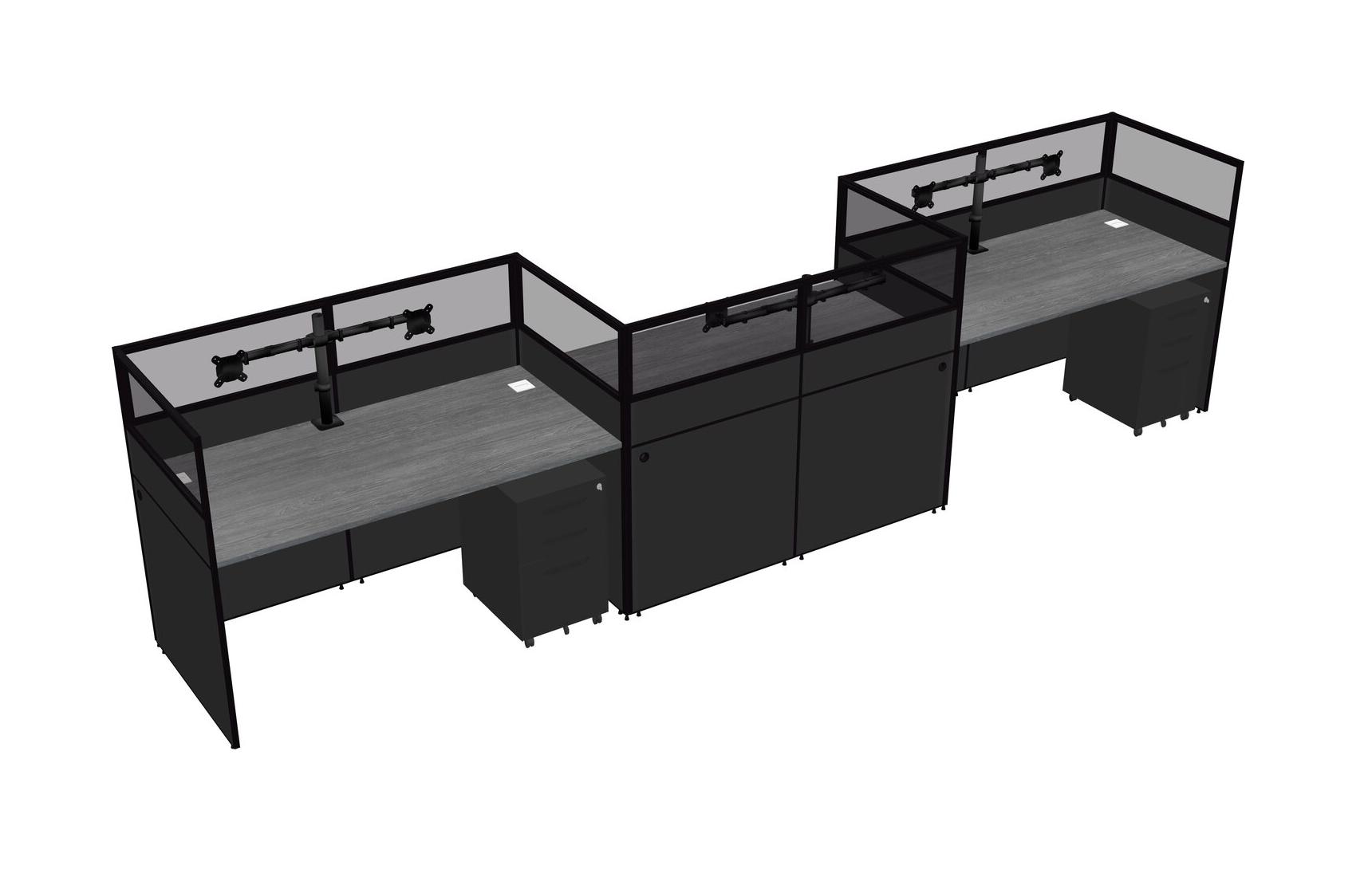 Grey Rectangular Cubicle Workstations For 3 - Zigzag Formation + Black Metal Mobile Drawers