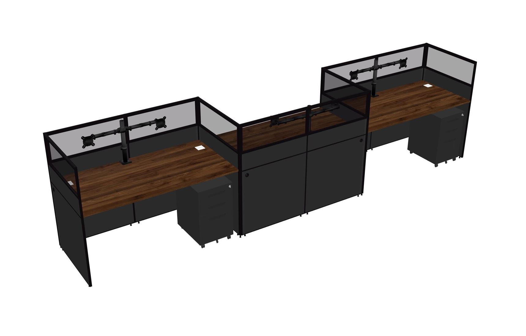 Columbia Walnut Rectangular Cubicle Workstations For 3 - Zigzag Formation + Black Metal Mobile Drawers