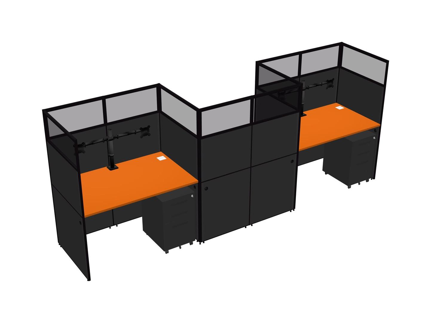 Orange Rectangular Cubicle Workstations For 3 - Zigzag Formation + Black Metal Mobile Drawers
