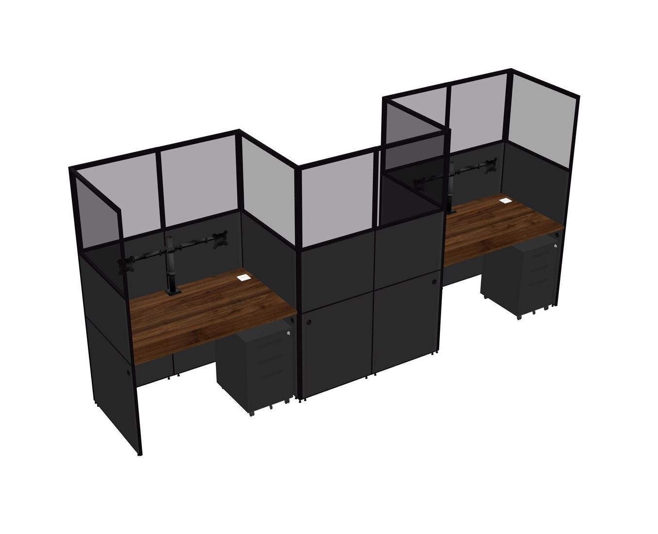 Columbia Walnut Rectangular Cubicle Workstations For 3 - Zigzag Formation + Black Metal Mobile Drawers