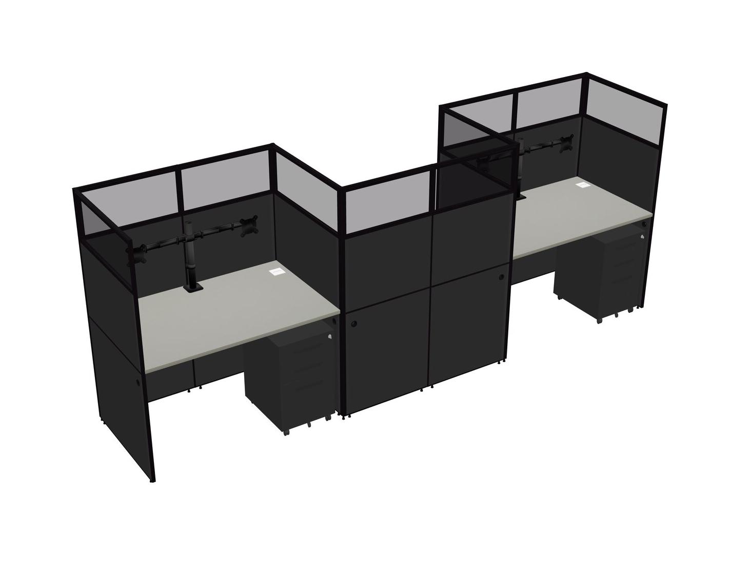 Grey Shadows Rectangular Cubicle Workstations For 3 - Zigzag Formation + Black Metal Mobile Drawers