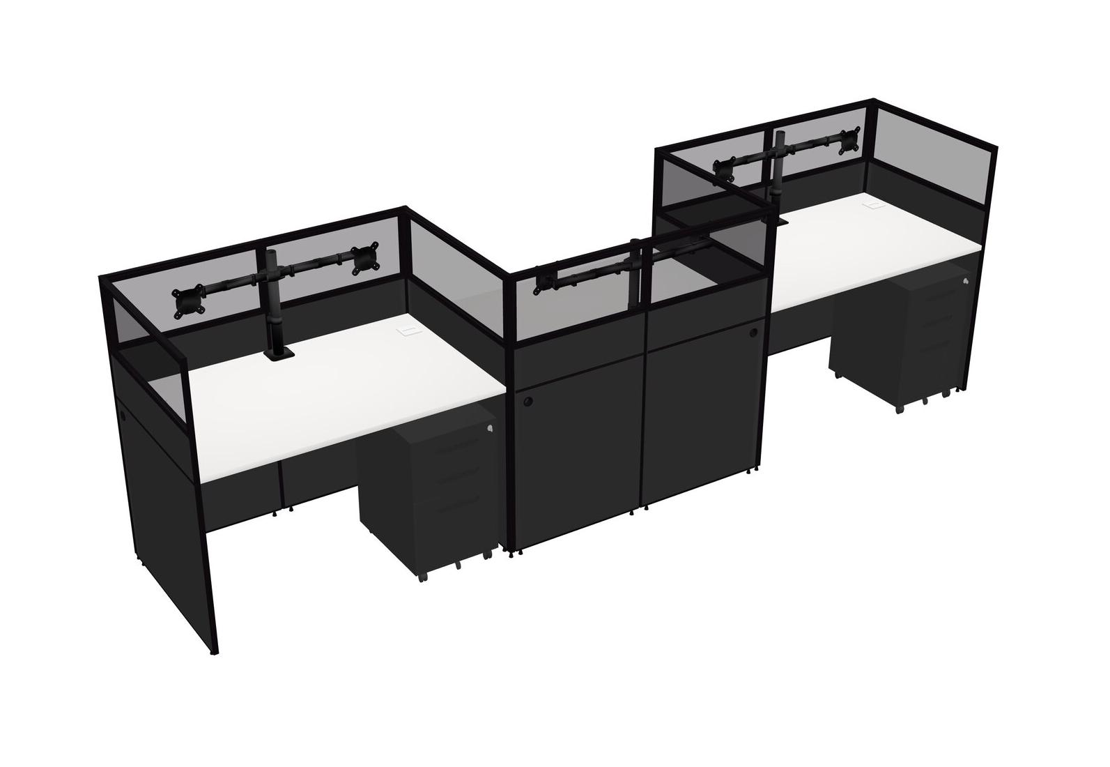 White Rectangular Cubicle Workstations For 3 - Zigzag Formation + Black Metal Mobile Drawers