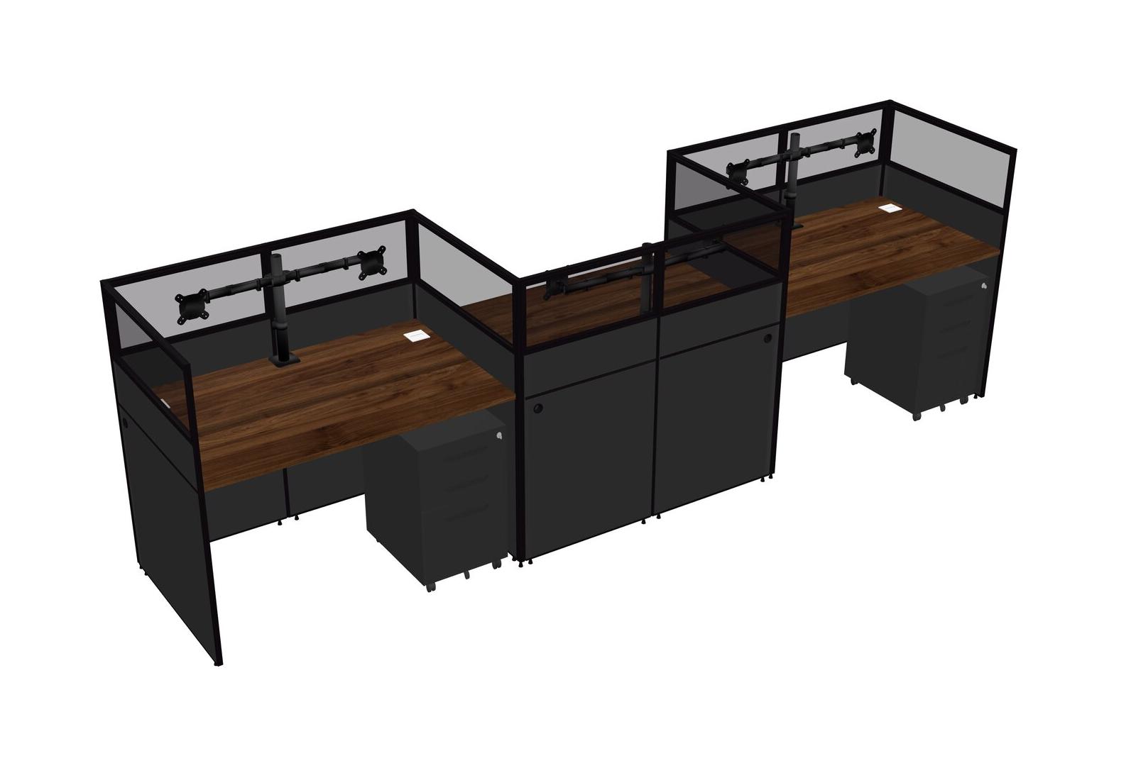 Columbia Walnut Rectangular Cubicle Workstations For 3 - Zigzag Formation + Black Metal Mobile Drawers