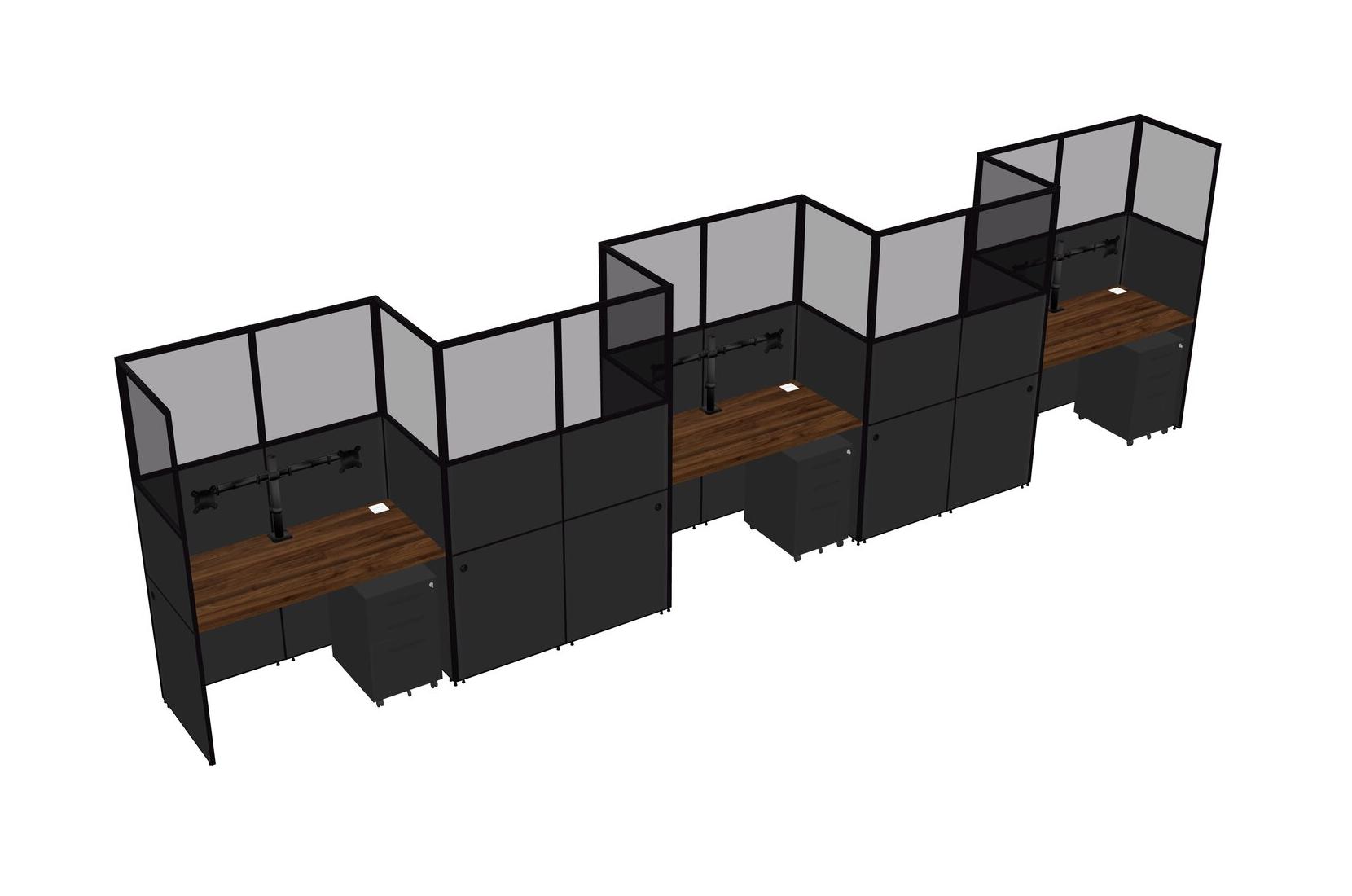 Columbia Walnut Rectangular Cubicle Workstations For 5 - Zigzag Formation + Black Metal Mobile Drawers
