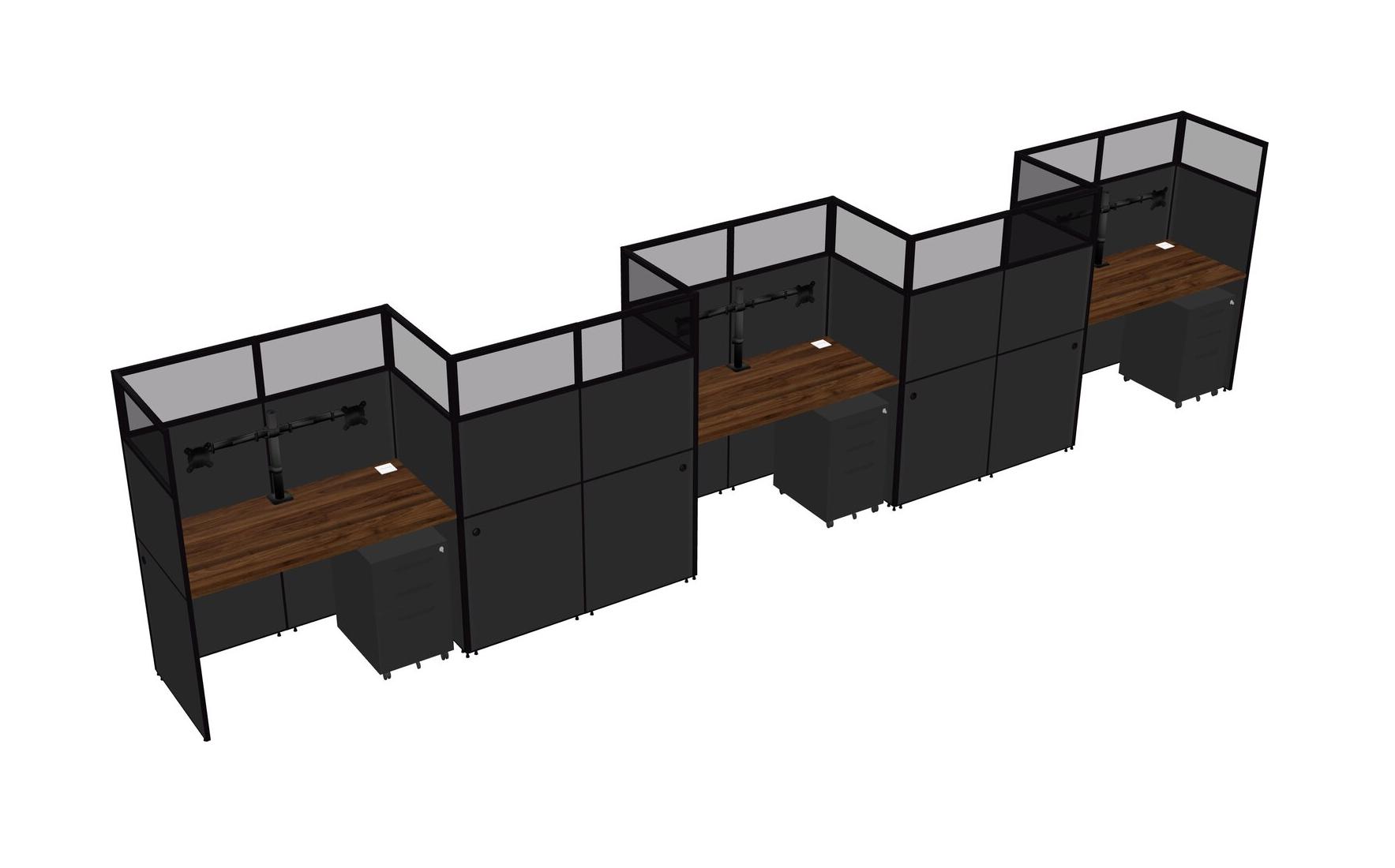 Columbia Walnut Rectangular Cubicle Workstations For 5 - Zigzag Formation + Black Metal Mobile Drawers