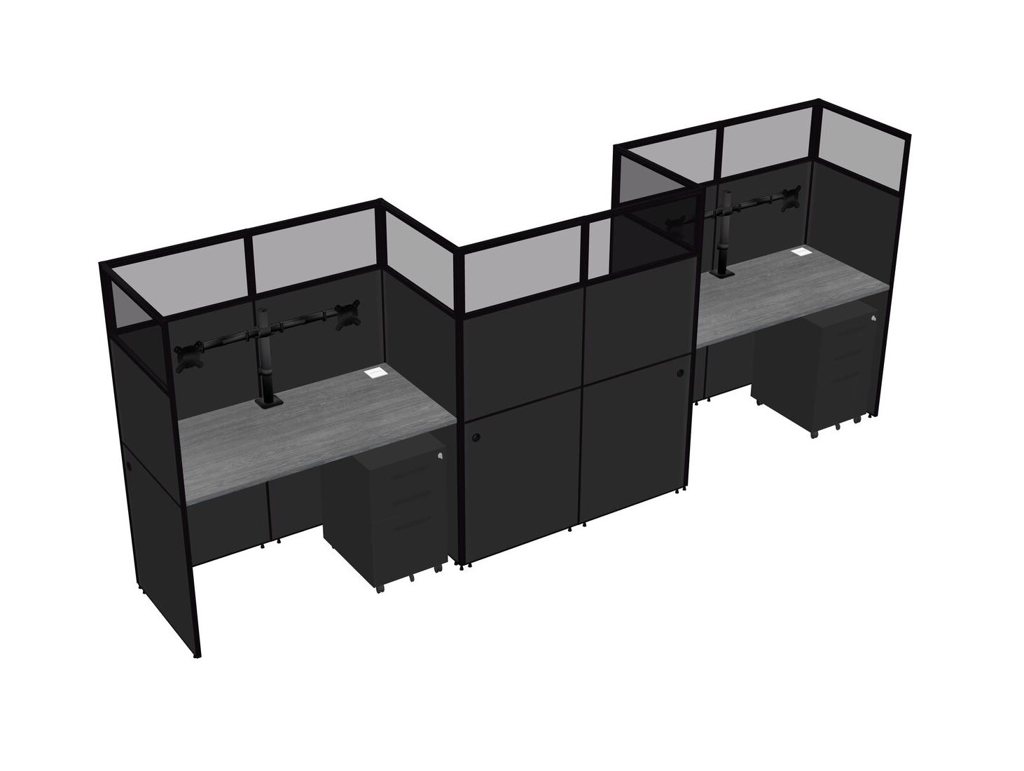 Grey Rectangular Cubicle Workstations For 3 - Zigzag Formation + Black Metal Mobile Drawers