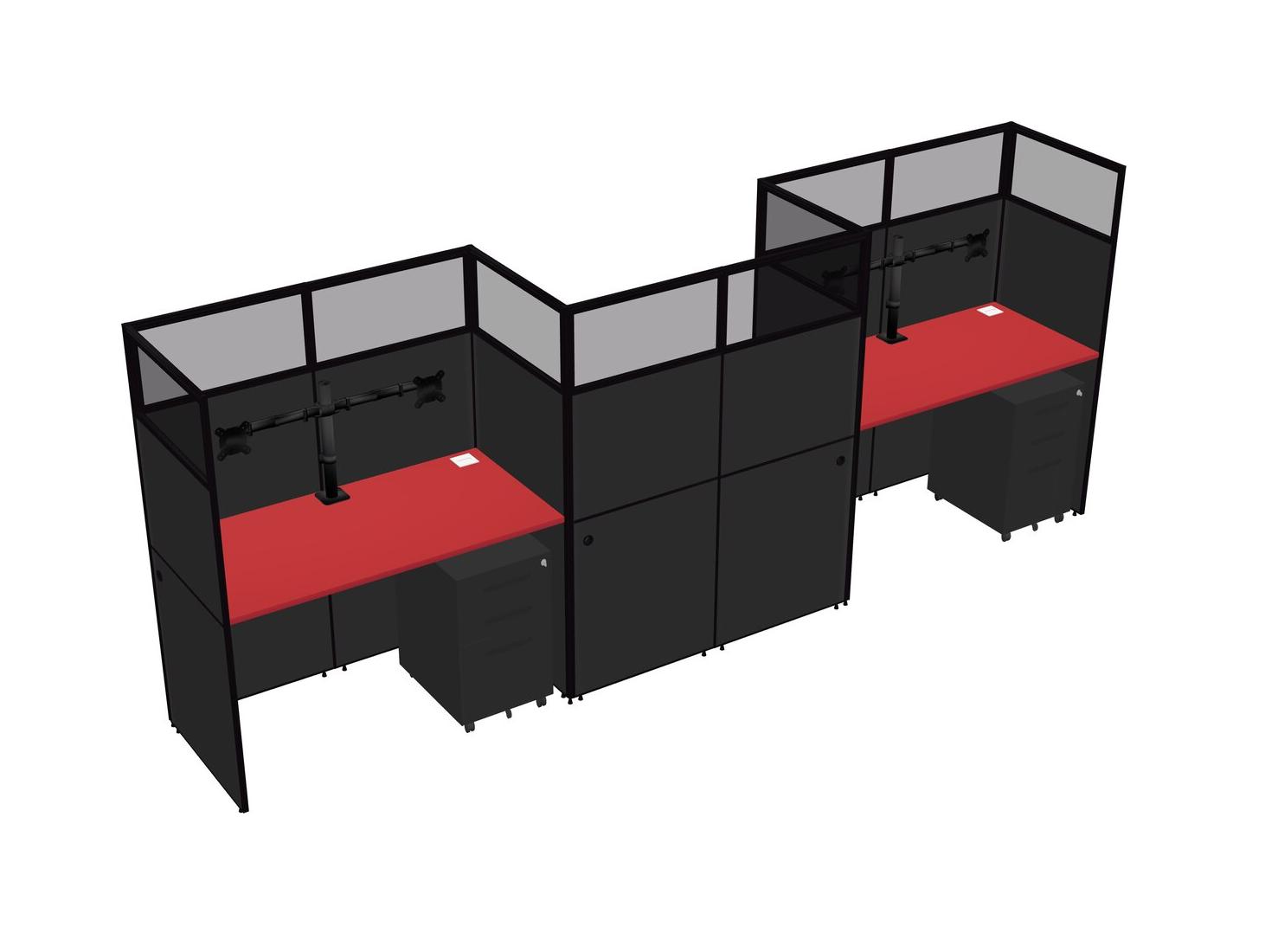 Prism Red Rectangular Cubicle Workstations For 3 - Zigzag Formation + Black Metal Mobile Drawers