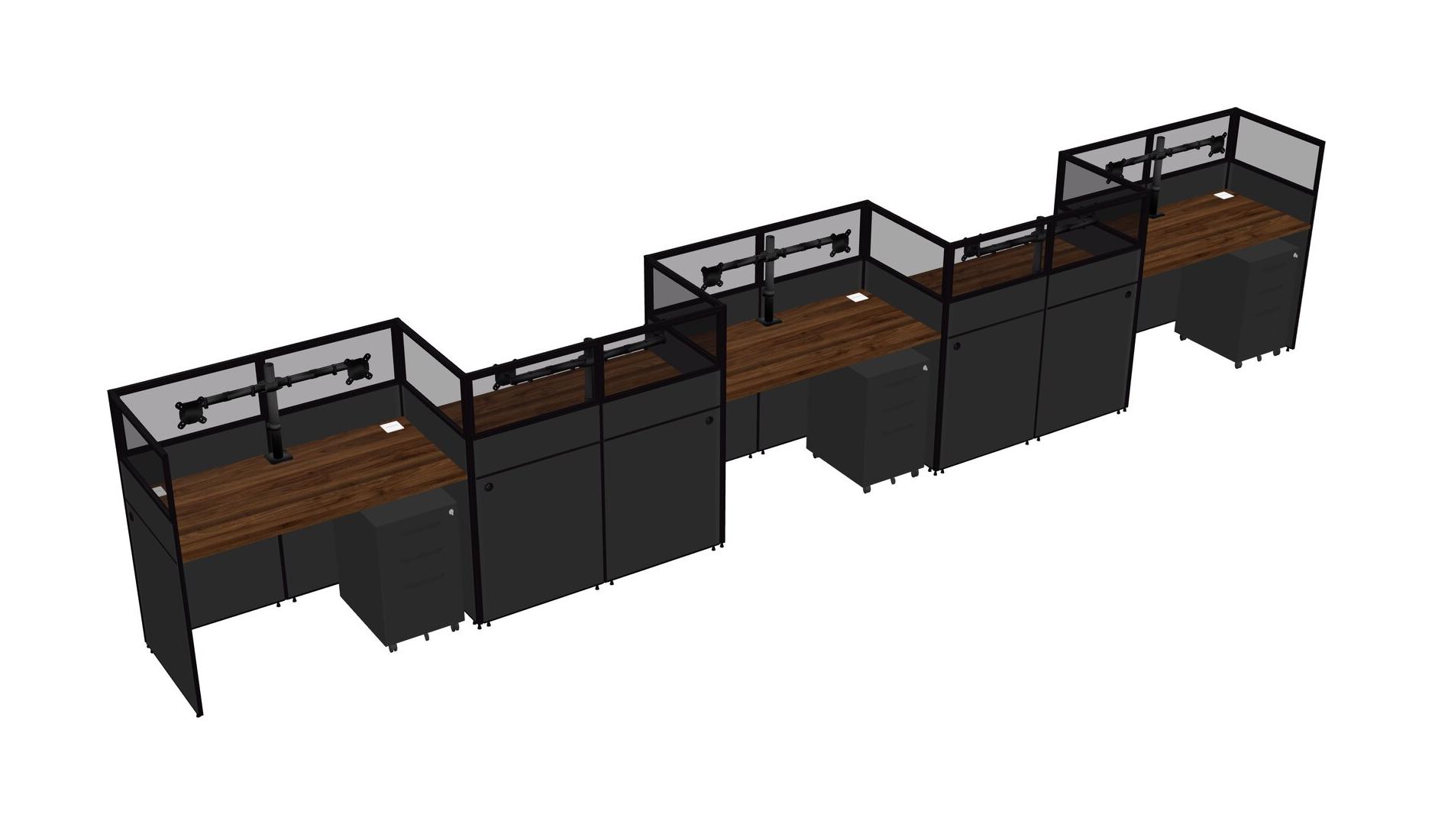 Columbia Walnut Rectangular Cubicle Workstations For 5 - Zigzag Formation + Black Metal Mobile Drawers