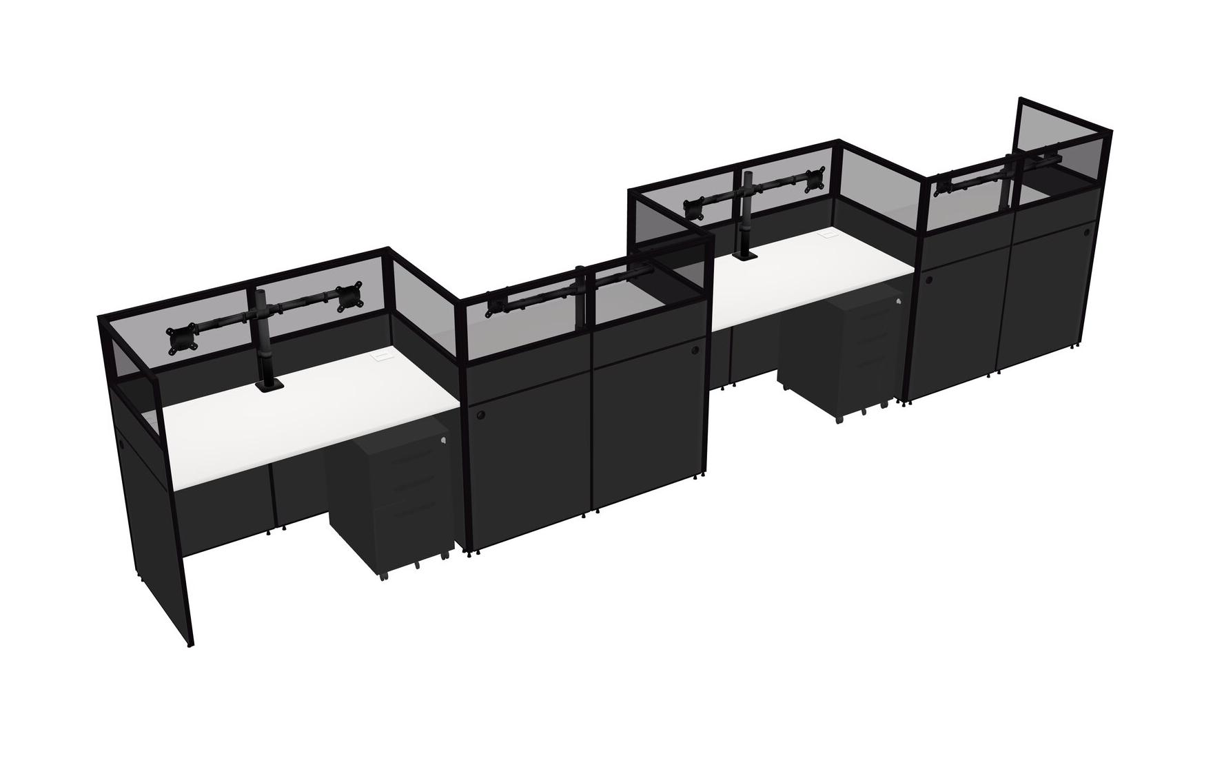 White Rectangular Cubicle Workstations For 4 - Zigzag Formation + Black Metal Mobile Drawers