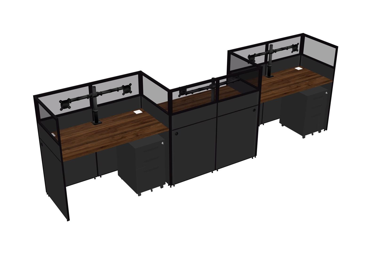 Columbia Walnut Rectangular Cubicle Workstations For 3 - Zigzag Formation + Black Metal Mobile Drawers