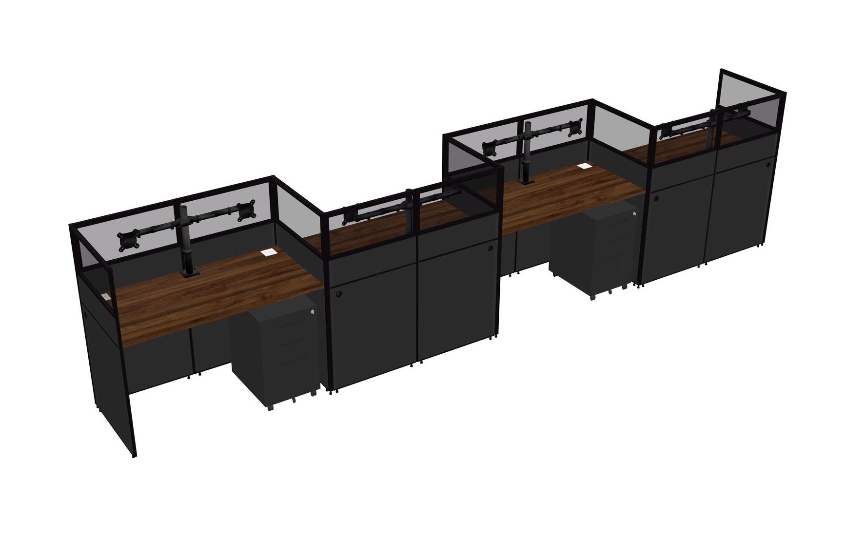 Columbia Walnut Rectangular Cubicle Workstations For 4 - Zigzag Formation + Black Metal Mobile Drawers