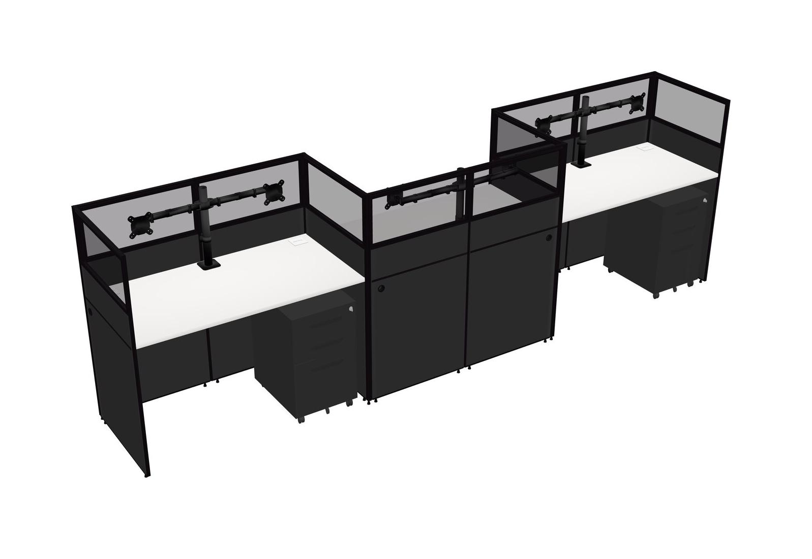 White Rectangular Cubicle Workstations For 3 - Zigzag Formation + Black Metal Mobile Drawers