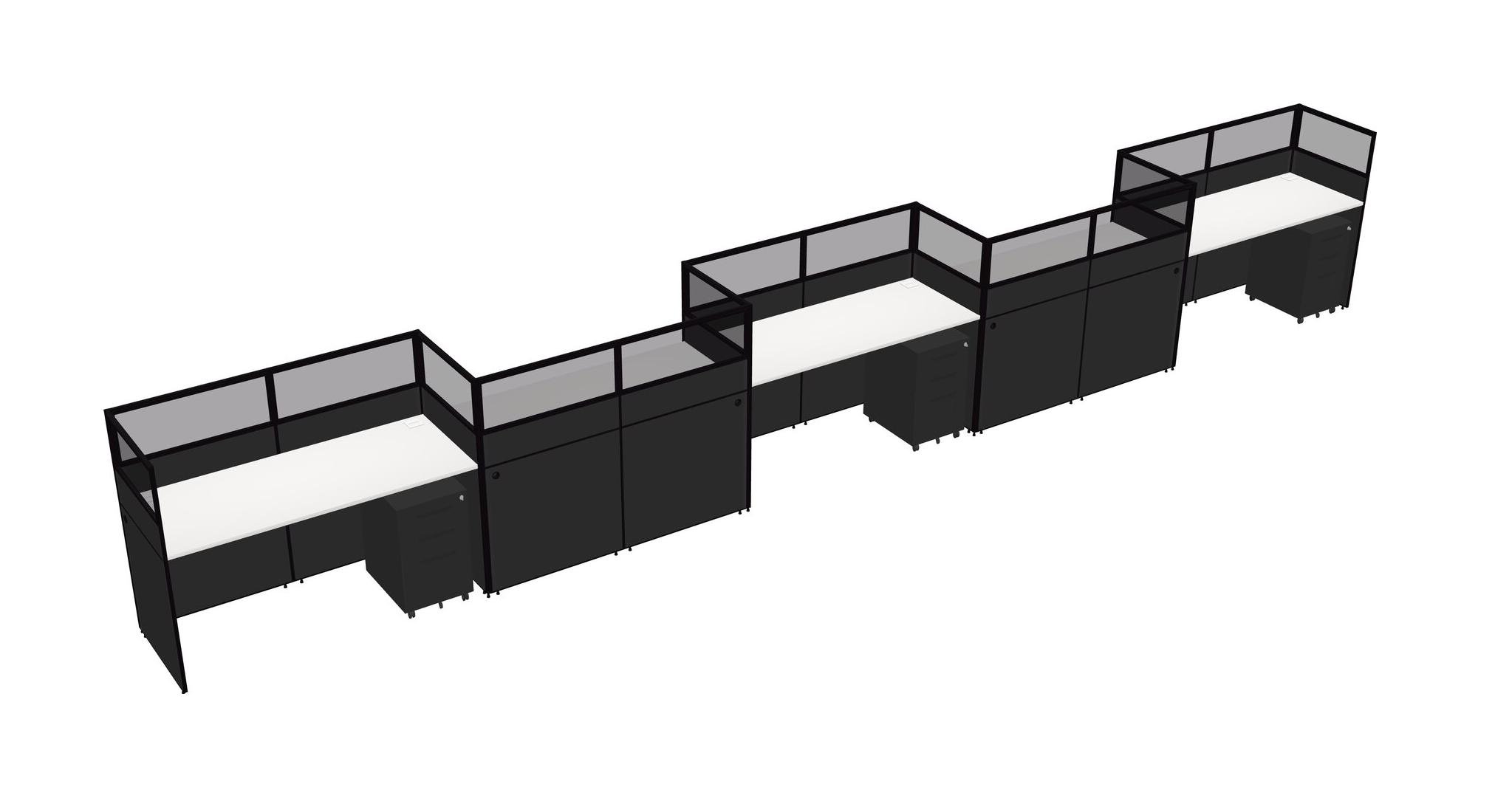 White Rectangular Cubicle Workstations For 5 - Zigzag Formation + Black Metal Mobile Drawers