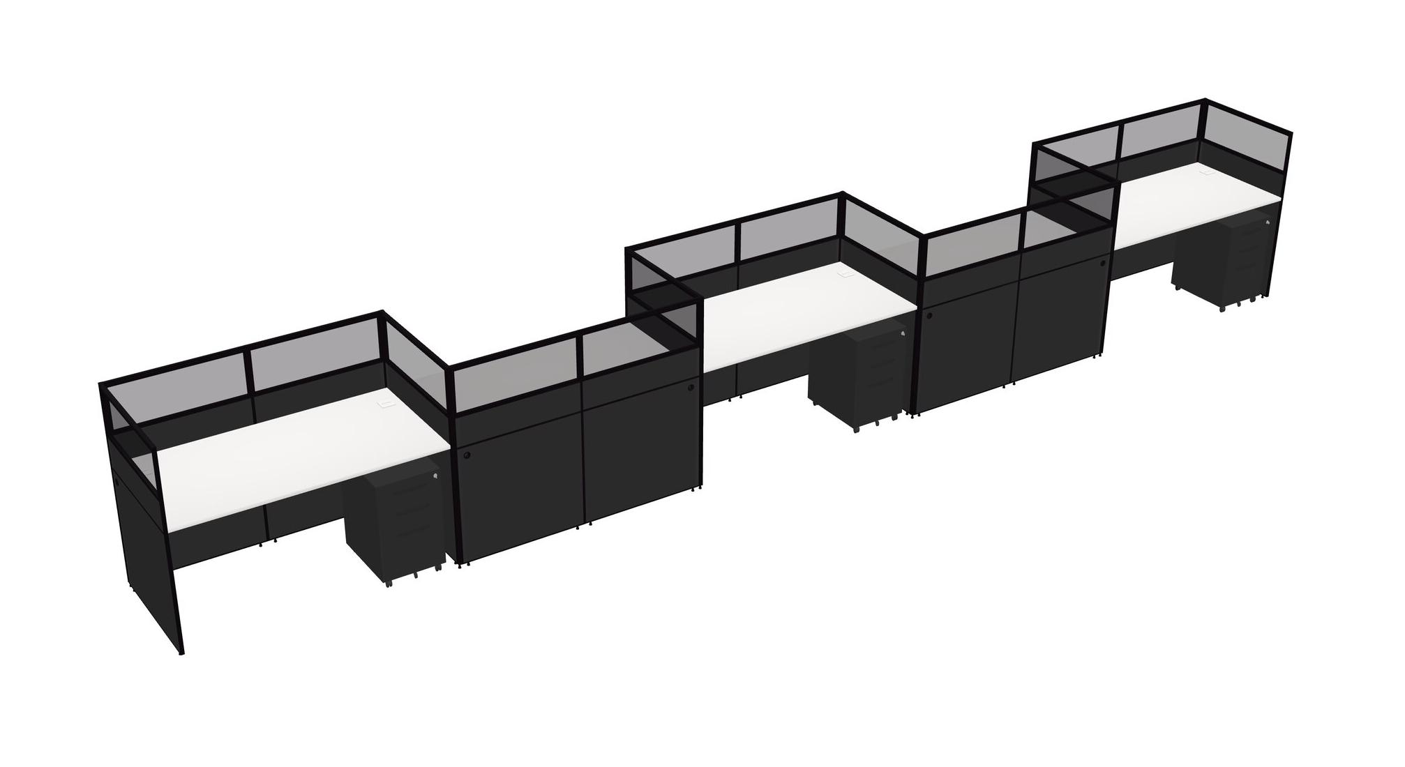 White Rectangular Cubicle Workstations For 5 - Zigzag Formation + Black Metal Mobile Drawers