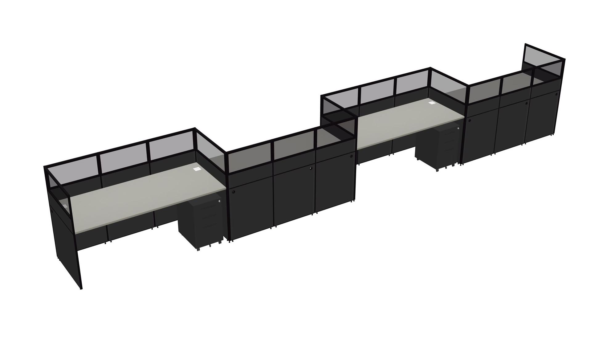 Grey Shadows Rectangular Cubicle Workstations For 4 - Zigzag Formation + Black Metal Mobile Drawers