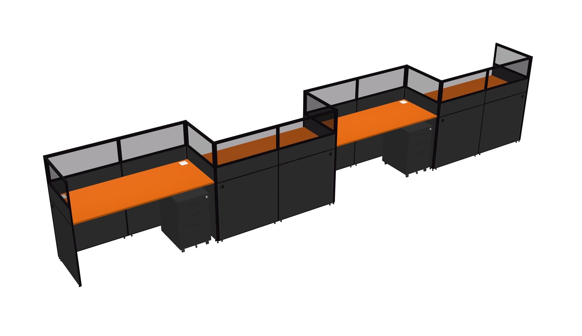 Orange Rectangular Cubicle Workstations For 4 - Zigzag Formation + Black Metal Mobile Drawers