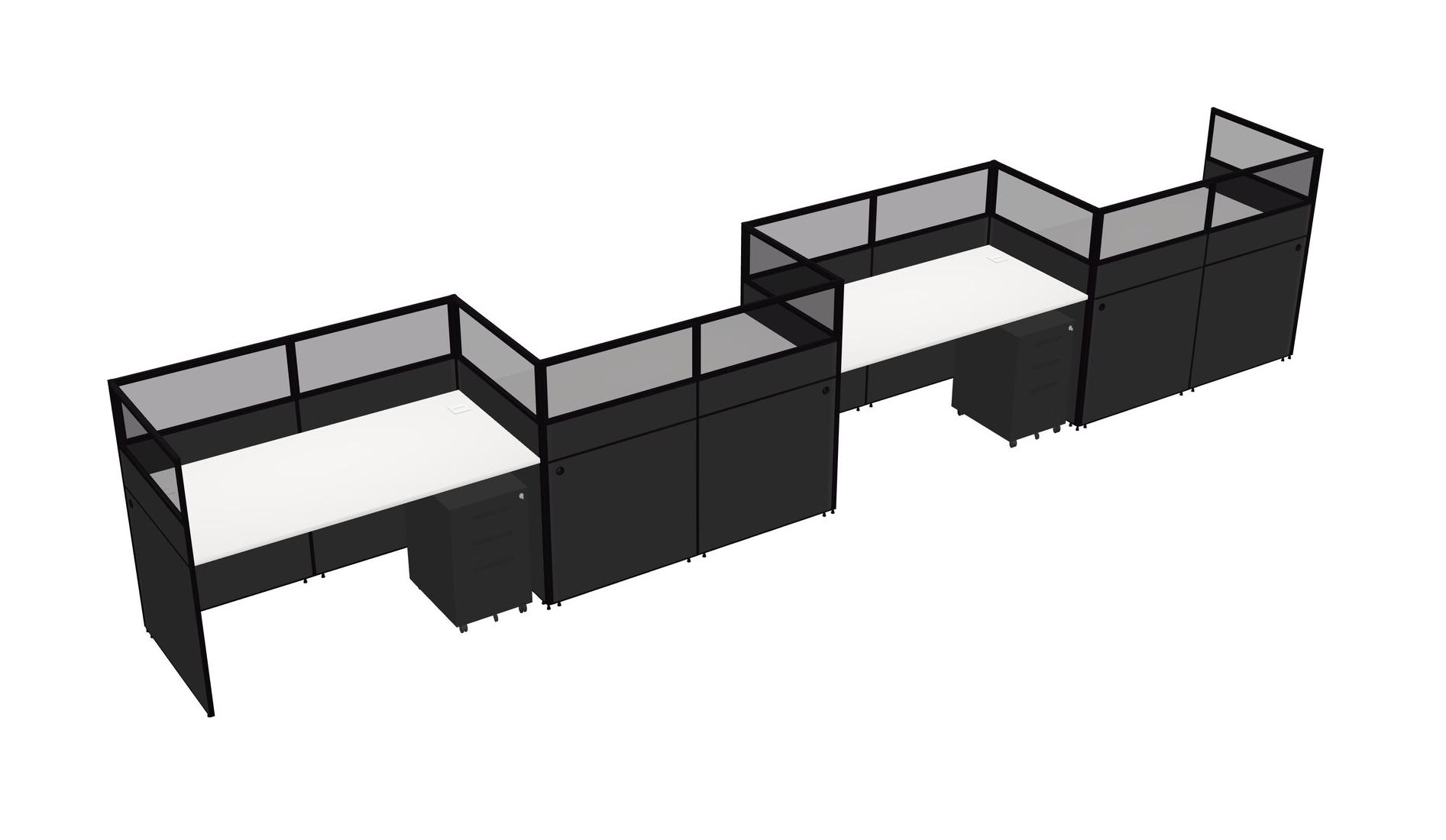 White Rectangular Cubicle Workstations For 4 - Zigzag Formation + Black Metal Mobile Drawers