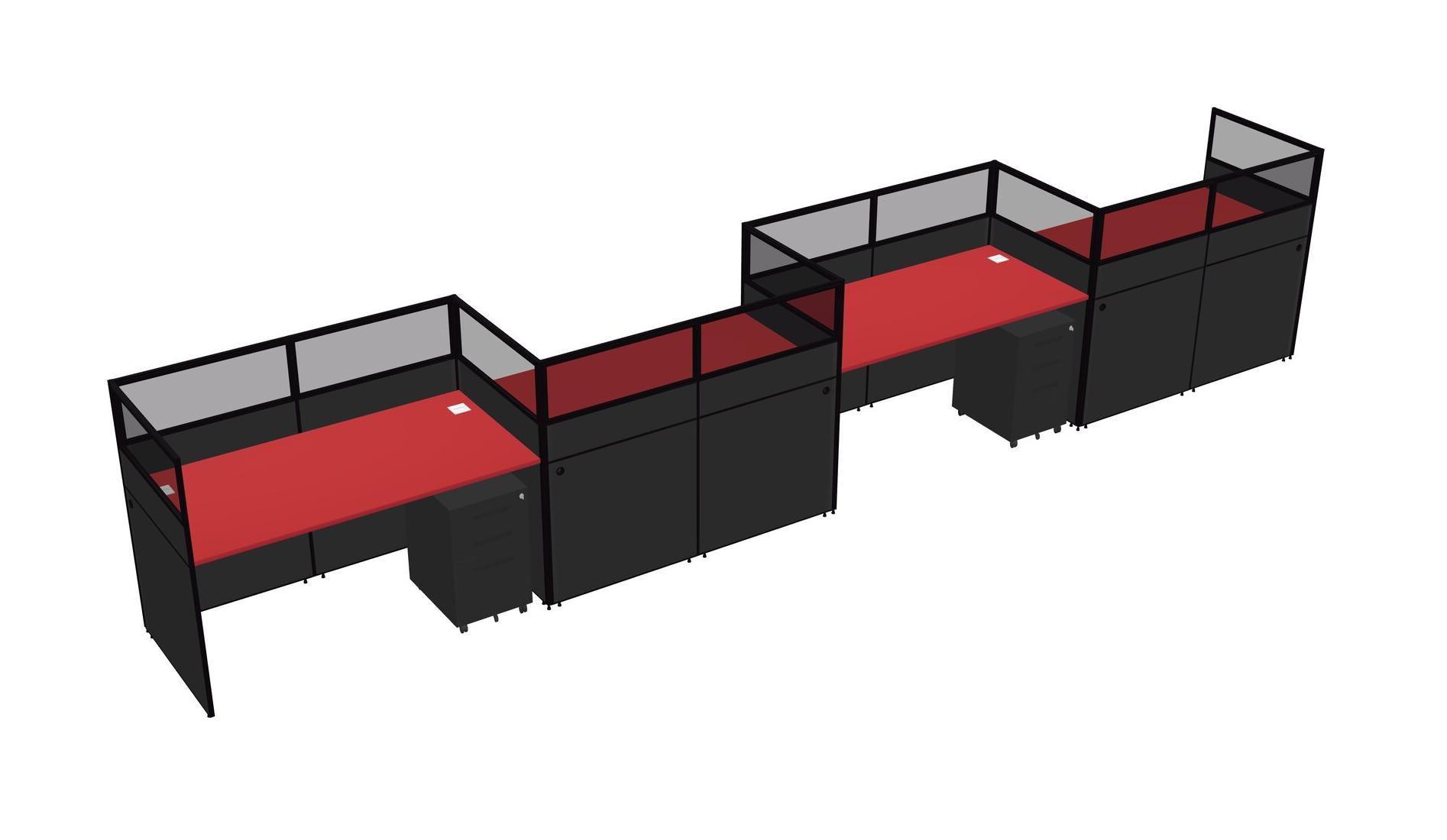 Prism Red Rectangular Cubicle Workstations For 4 - Zigzag Formation + Black Metal Mobile Drawers
