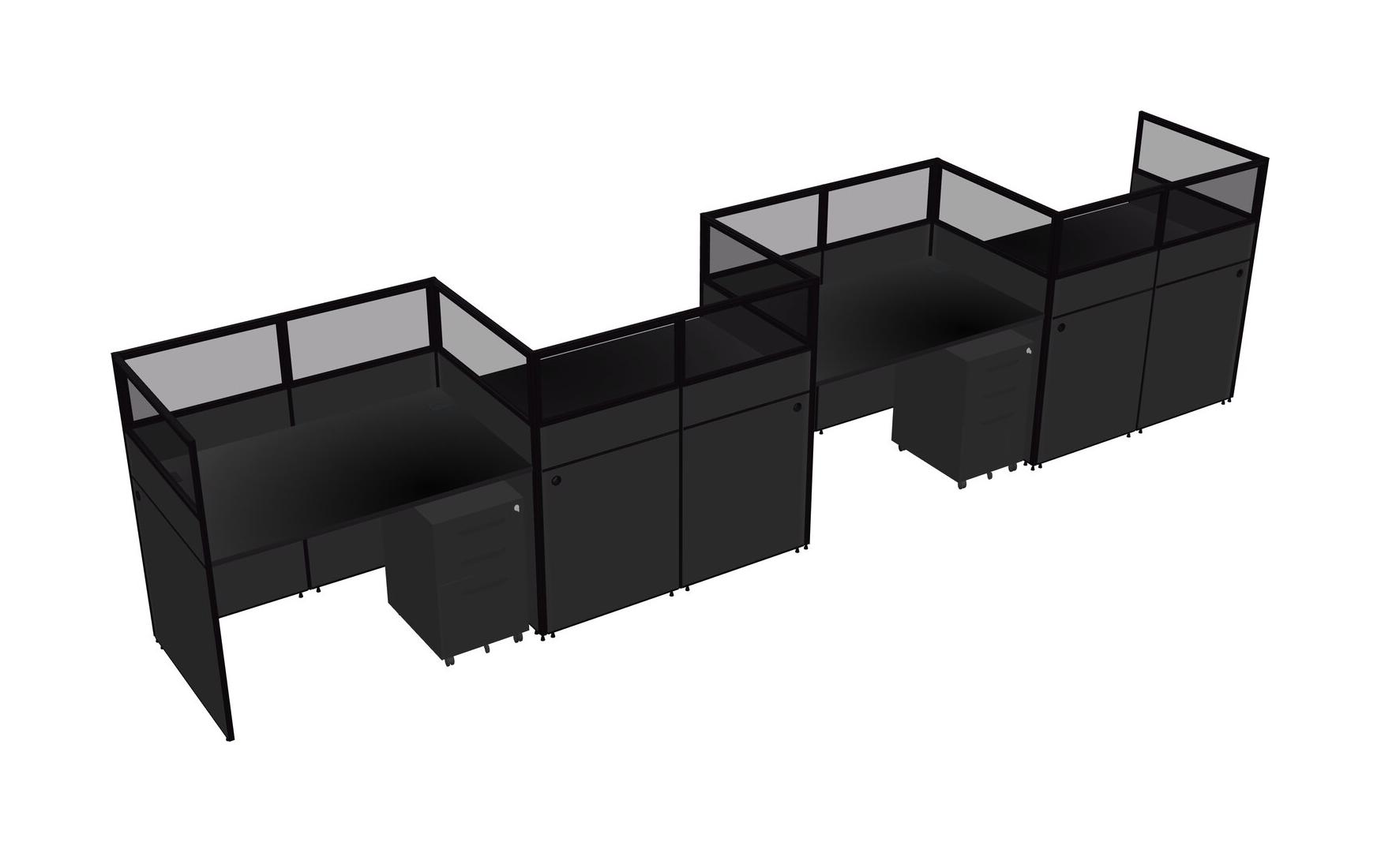 Black Rectangular Cubicle Workstations For 4 - Zigzag Formation + Black Metal Mobile Drawers