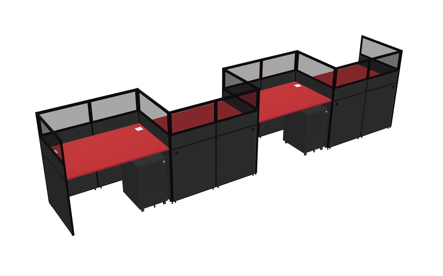 Prism Red Rectangular Cubicle Workstations For 4 - Zigzag Formation + Black Metal Mobile Drawers