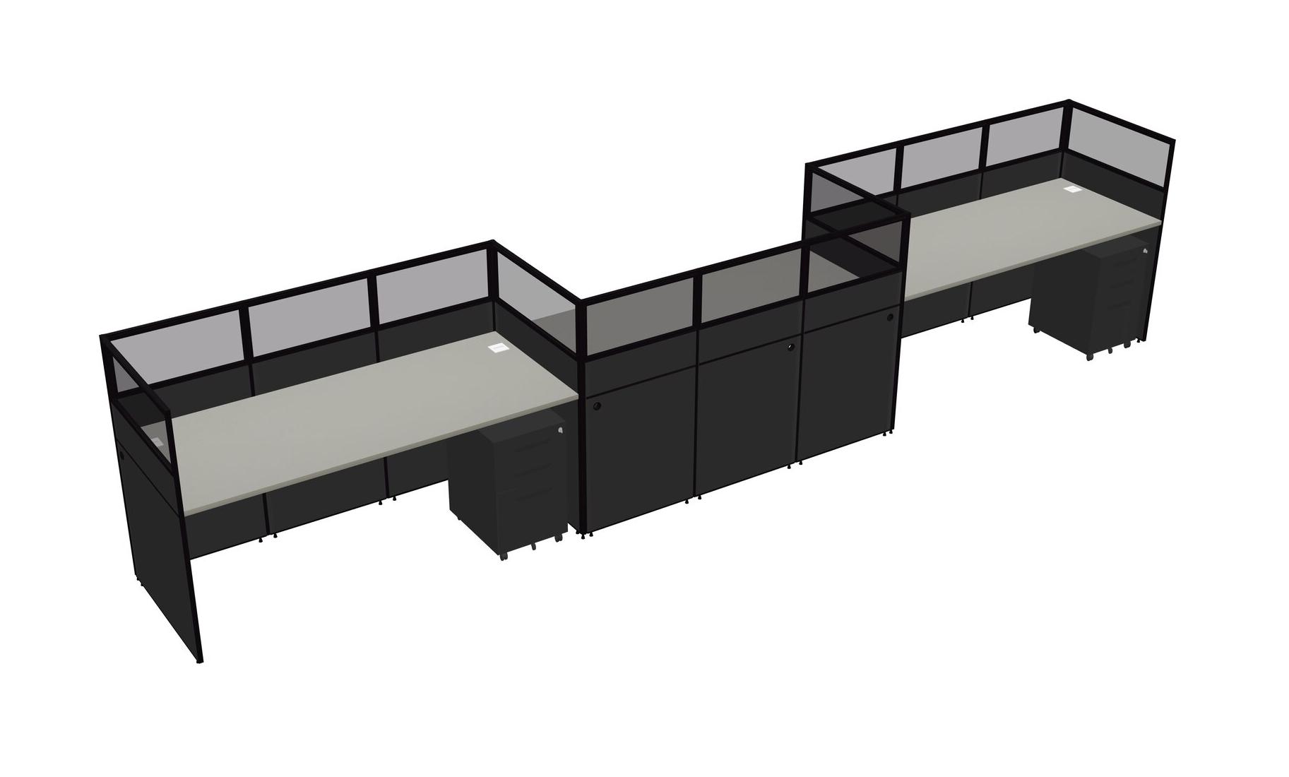 Grey Shadows Rectangular Cubicle Workstations For 3 - Zigzag Formation + Black Metal Mobile Drawers