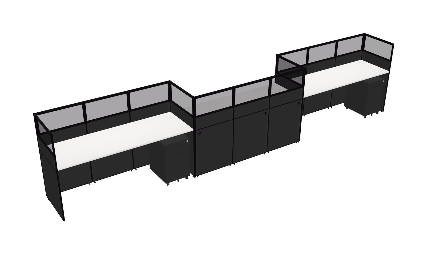 White Rectangular Cubicle Workstations For 3 - Zigzag Formation + Black Metal Mobile Drawers
