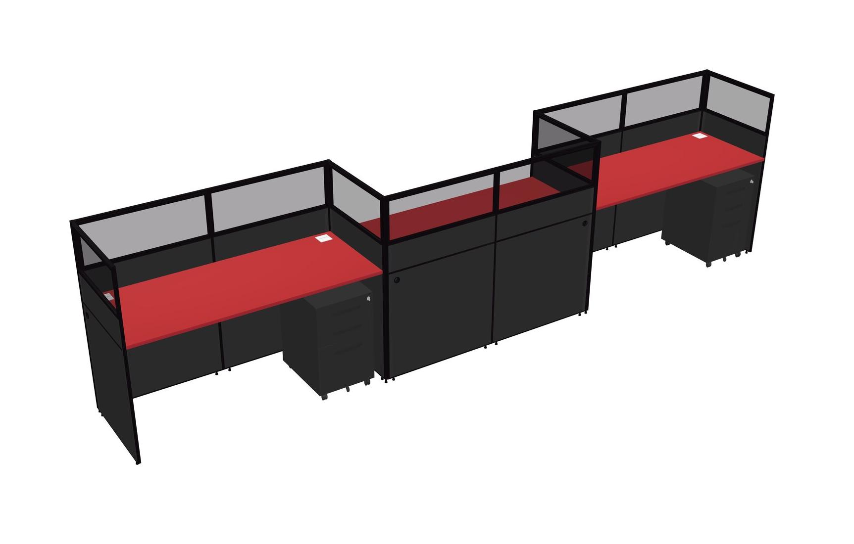 Prism Red Rectangular Cubicle Workstations For 3 - Zigzag Formation + Black Metal Mobile Drawers