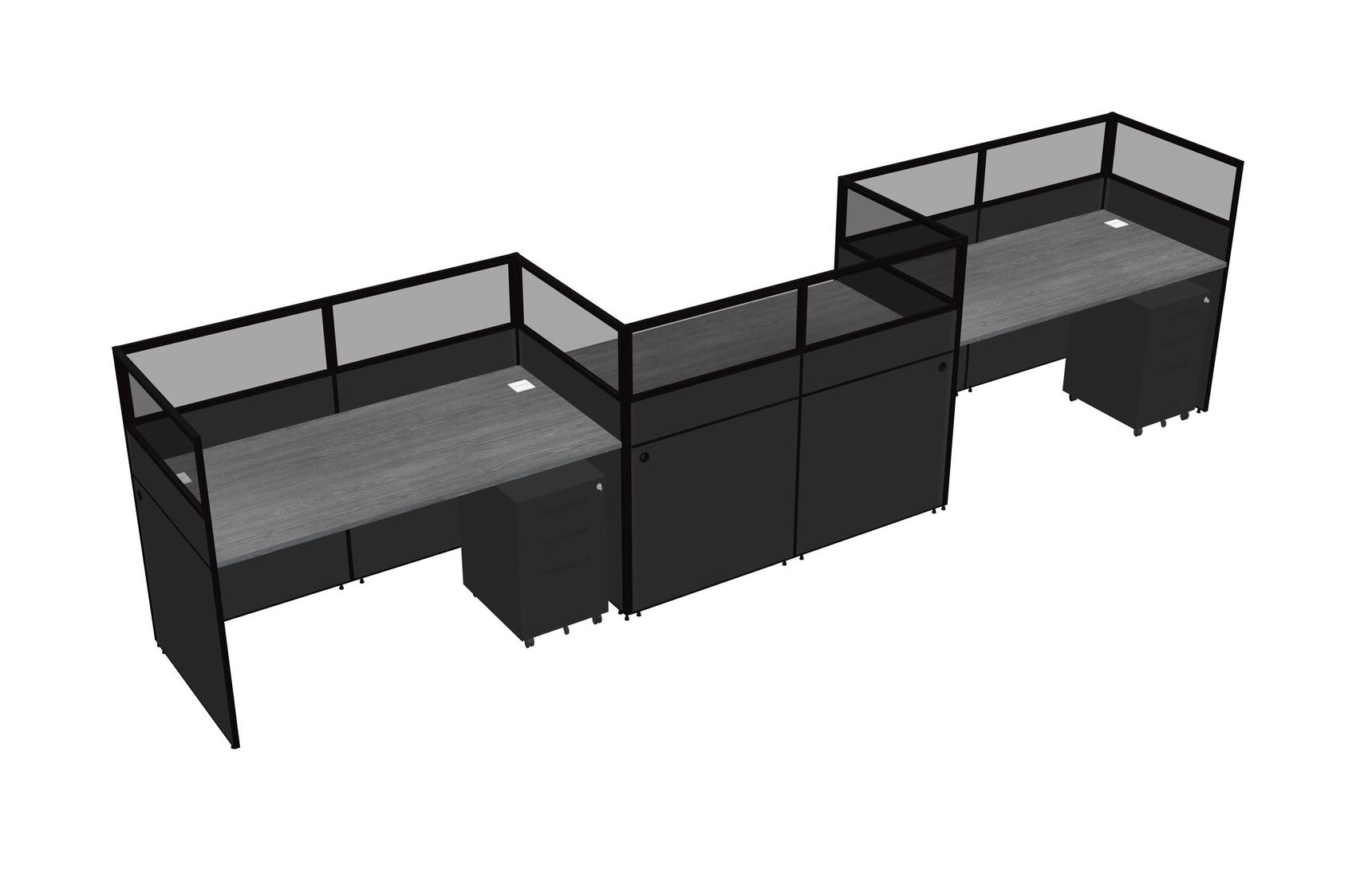 Grey Rectangular Cubicle Workstations For 3 - Zigzag Formation + Black Metal Mobile Drawers