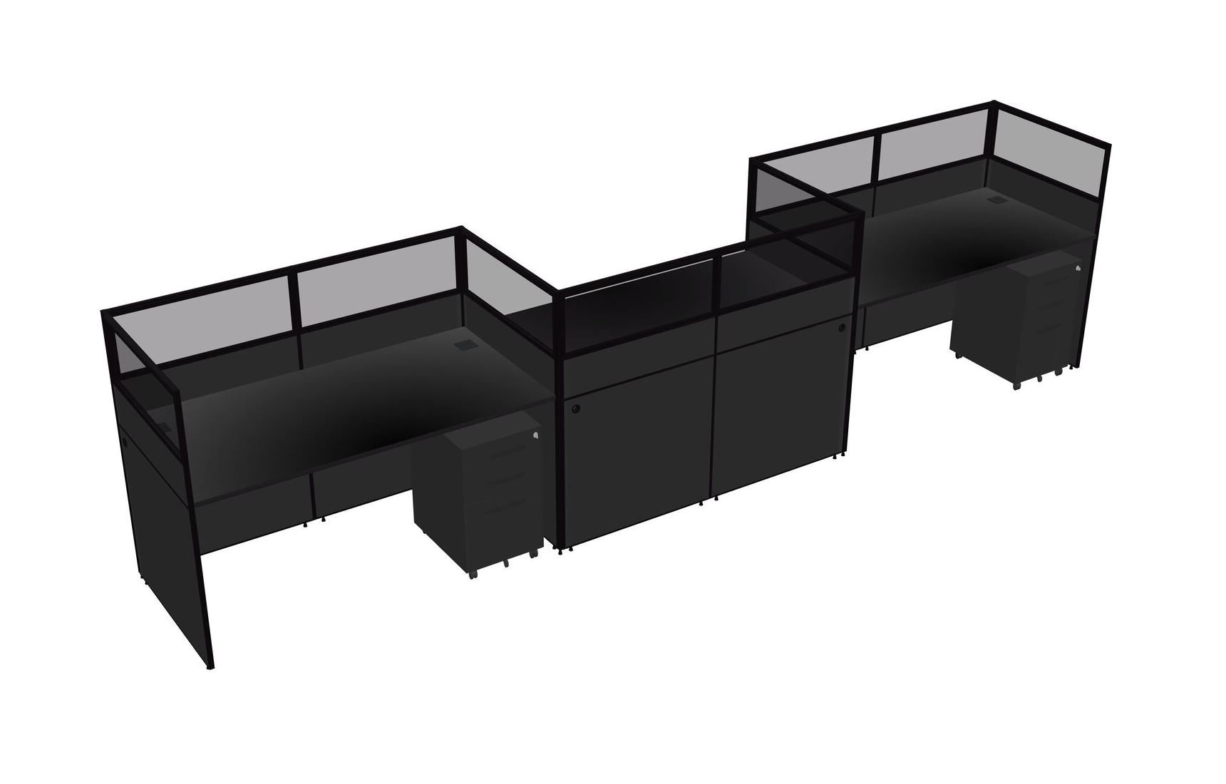 Black Rectangular Cubicle Workstations For 3 - Zigzag Formation + Black Metal Mobile Drawers