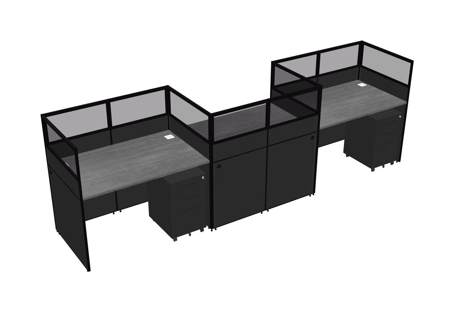 Grey Rectangular Cubicle Workstations For 3 - Zigzag Formation + Black Metal Mobile Drawers