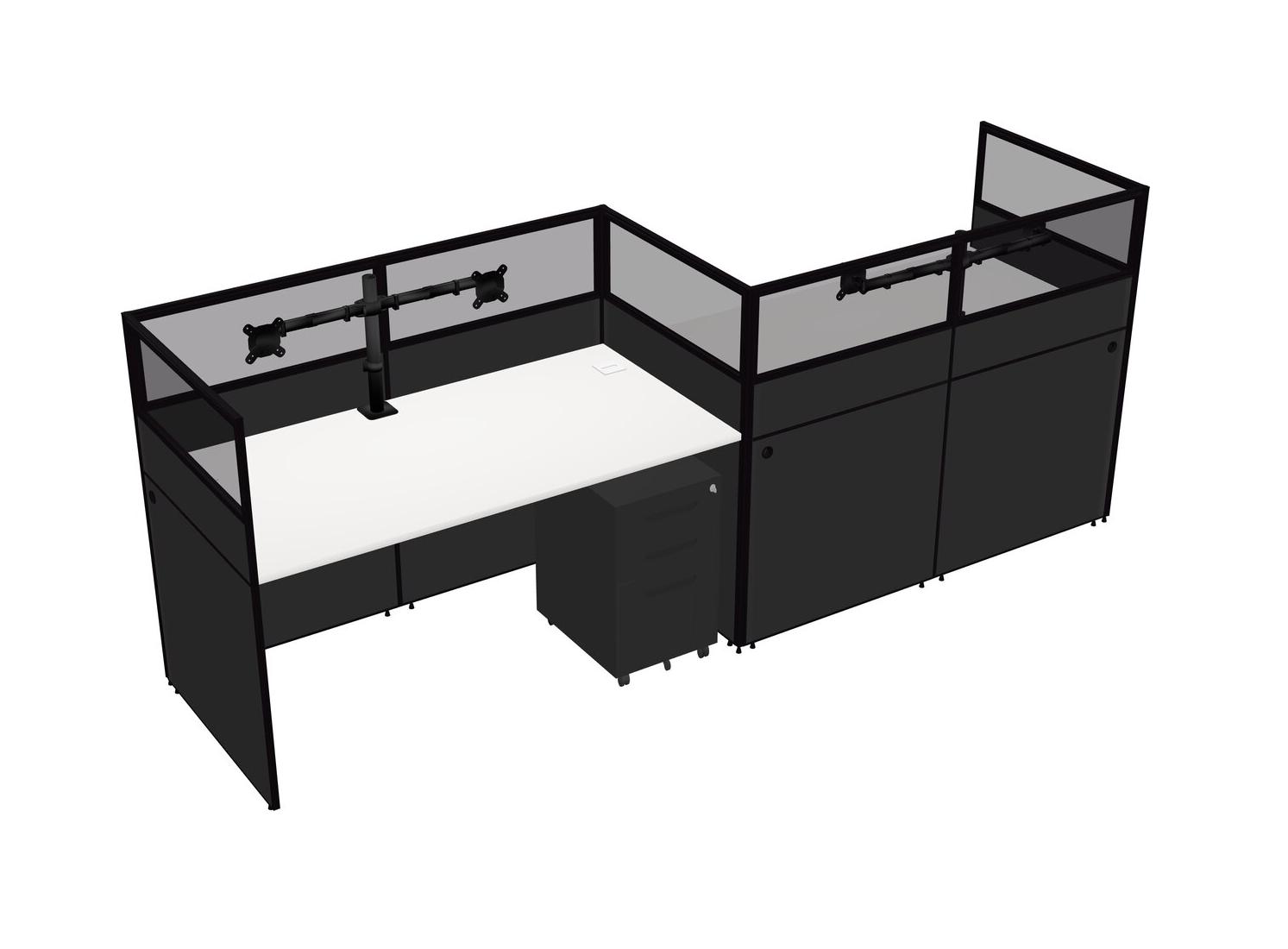 White Rectangular Cubicle Workstations For 2 - Zigzag Formation + Black Metal Mobile Drawers