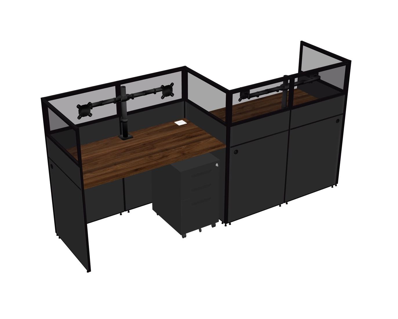 Columbia Walnut Rectangular Cubicle Workstations For 2 - Zigzag Formation + Black Metal Mobile Drawers