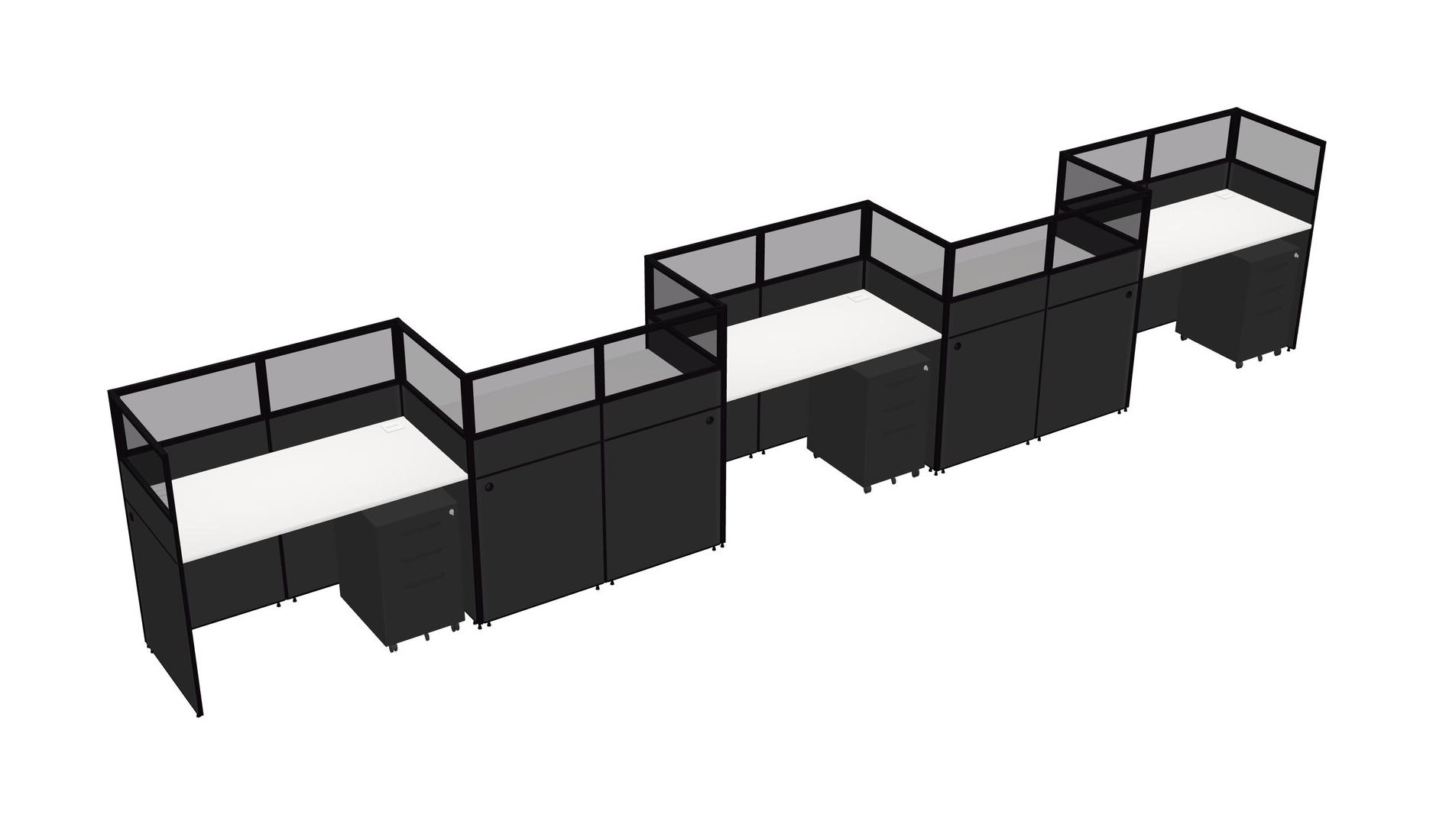 White Rectangular Cubicle Workstations For 5 - Zigzag Formation + Black Metal Mobile Drawers
