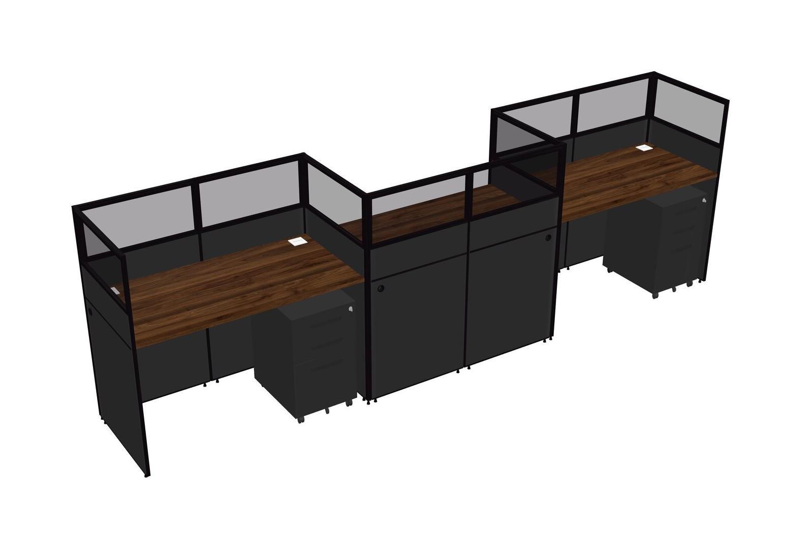 Columbia Walnut Rectangular Cubicle Workstations For 3 - Zigzag Formation + Black Metal Mobile Drawers