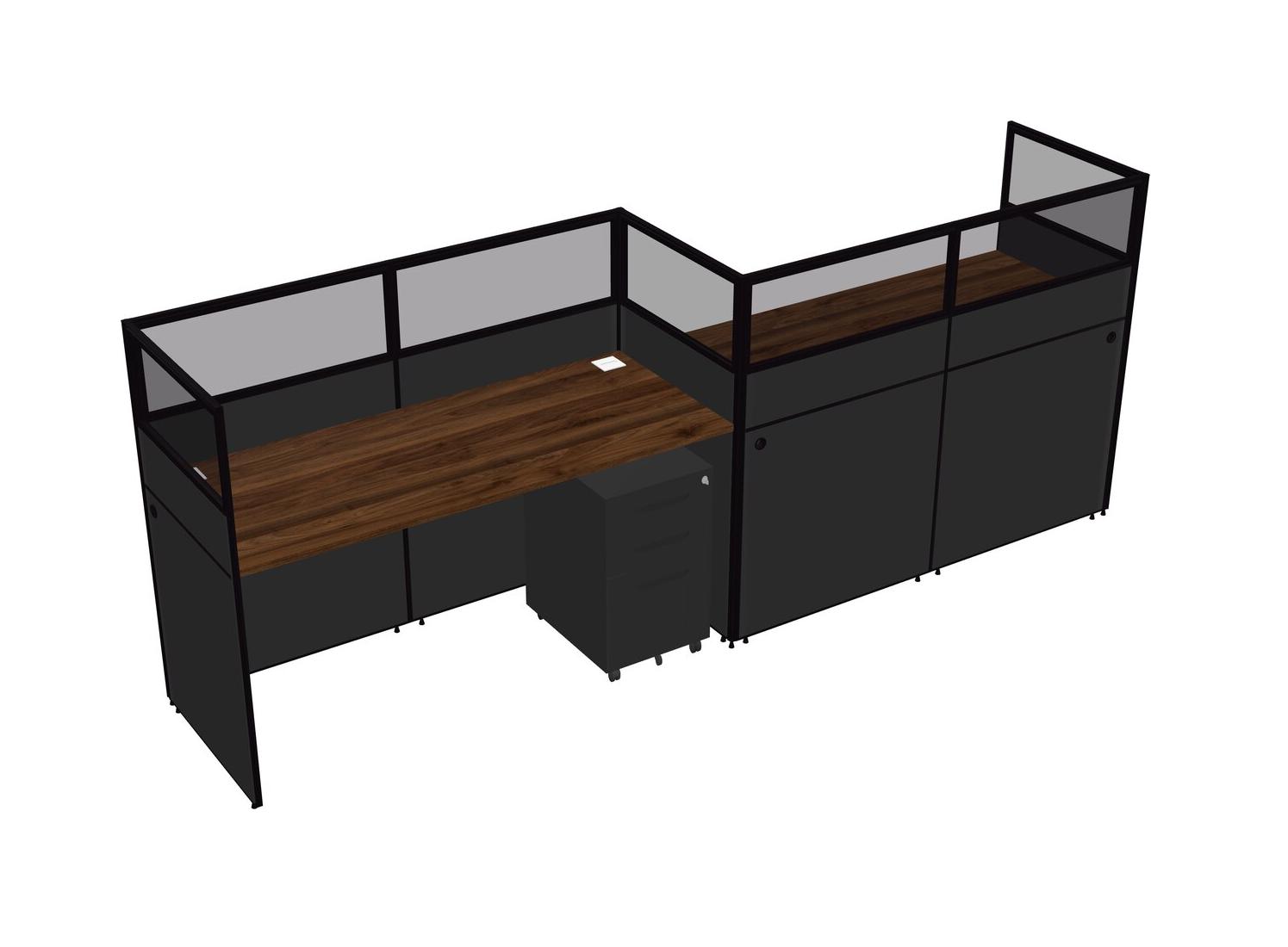 Columbia Walnut Rectangular Cubicle Workstations For 2 - Zigzag Formation + Black Metal Mobile Drawers