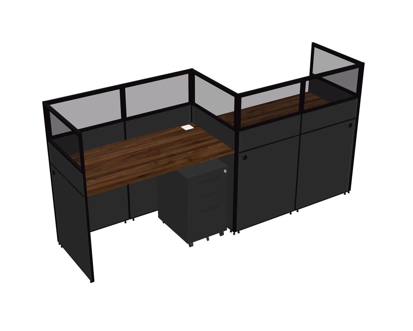 Columbia Walnut Rectangular Cubicle Workstations For 2 - Zigzag Formation + Black Metal Mobile Drawers