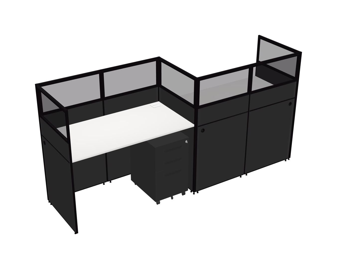 White Rectangular Cubicle Workstations For 2 - Zigzag Formation + Black Metal Mobile Drawers