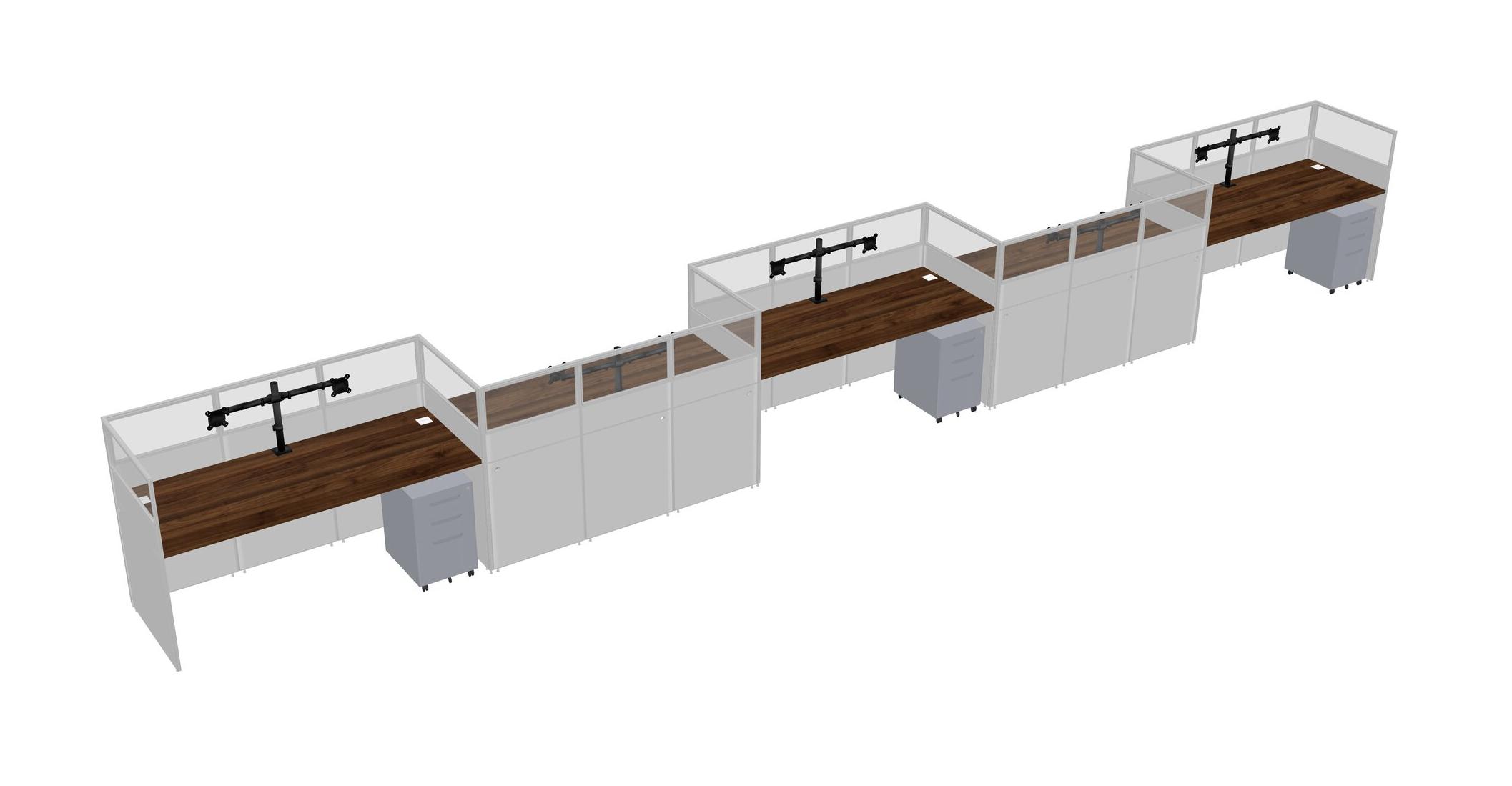 Columbia Walnut Rectangular Cubicle Workstations For 5 - Zigzag Formation + Grey Metal Mobile Drawers