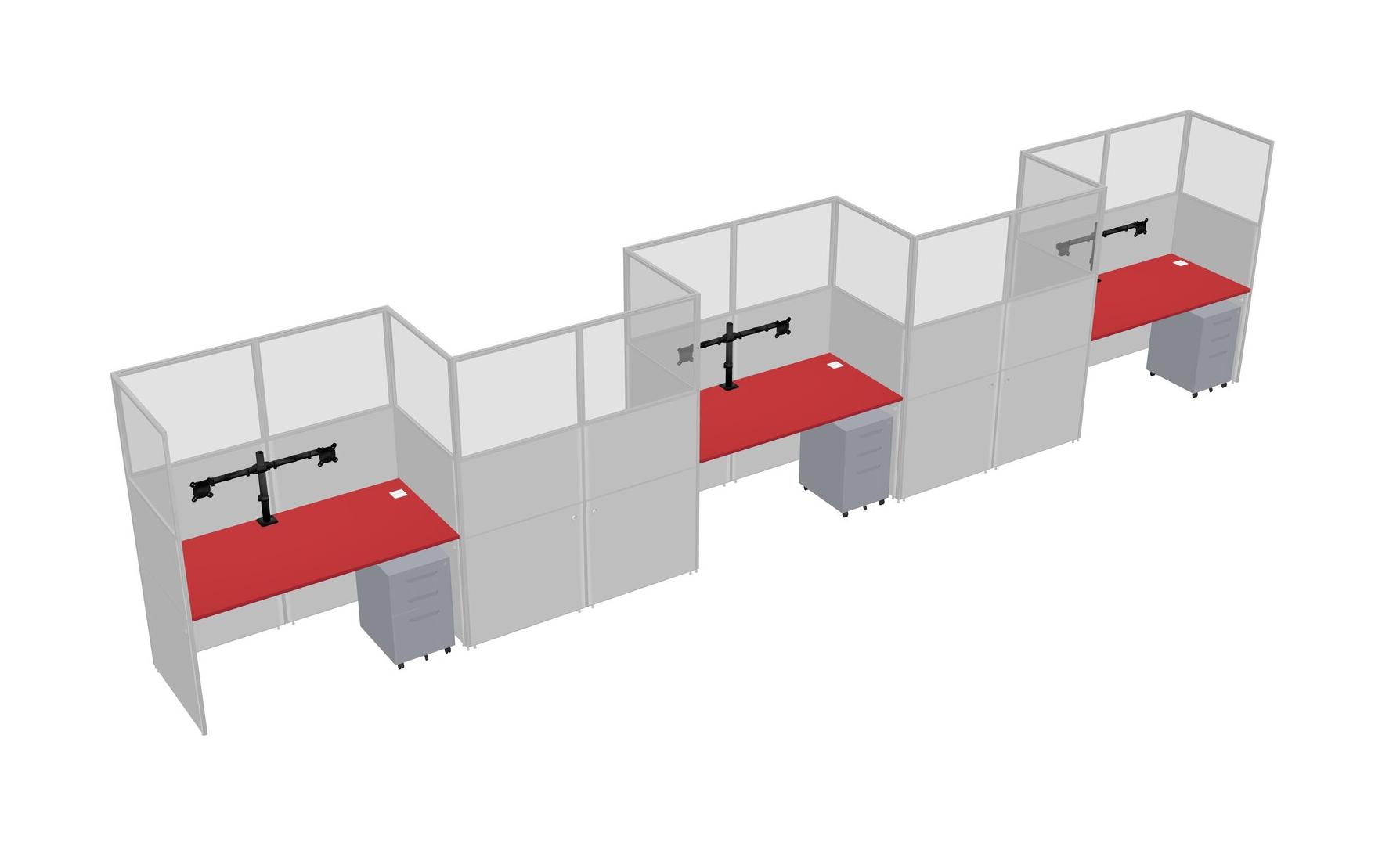 Prism Red Rectangular Cubicle Workstations For 5 - Zigzag Formation + Grey Metal Mobile Drawers