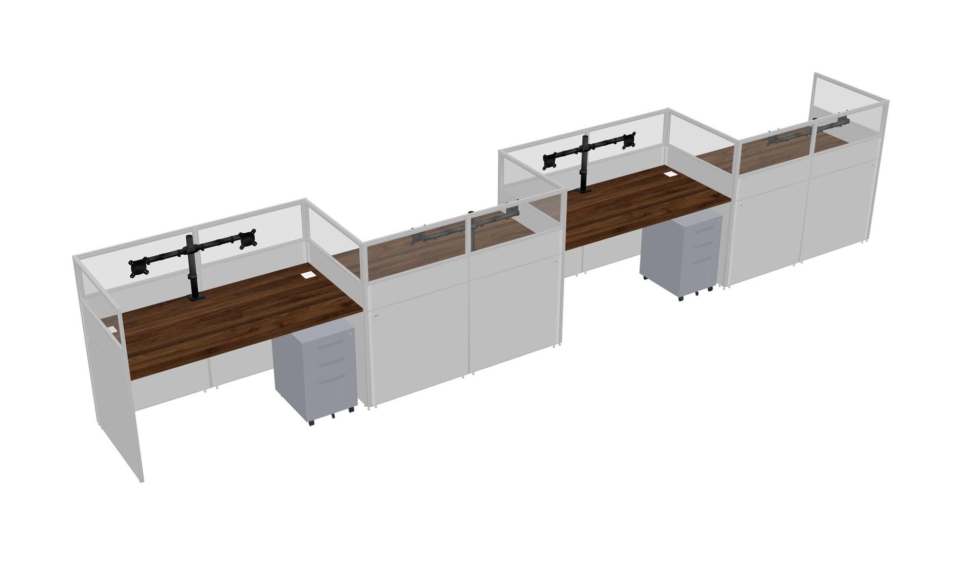 Columbia Walnut Rectangular Cubicle Workstations For 4 - Zigzag Formation + Grey Metal Mobile Drawers