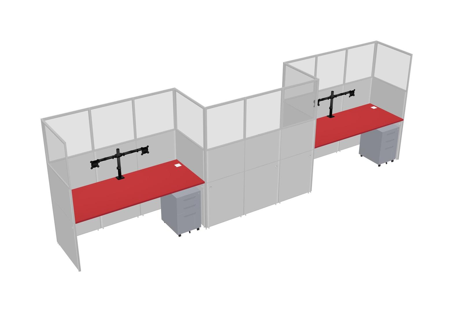 Prism Red Rectangular Cubicle Workstations For 3 - Zigzag Formation + Grey Metal Mobile Drawers