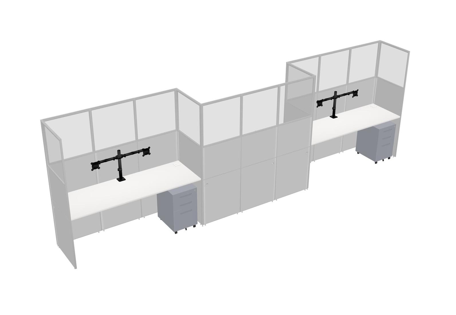White Rectangular Cubicle Workstations For 3 - Zigzag Formation + Grey Metal Mobile Drawers