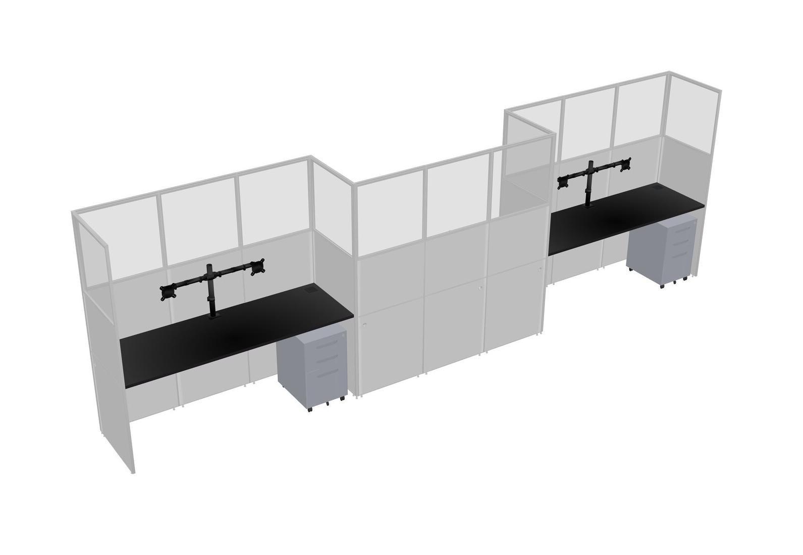 Black Rectangular Cubicle Workstations For 3 - Zigzag Formation + Grey Metal Mobile Drawers
