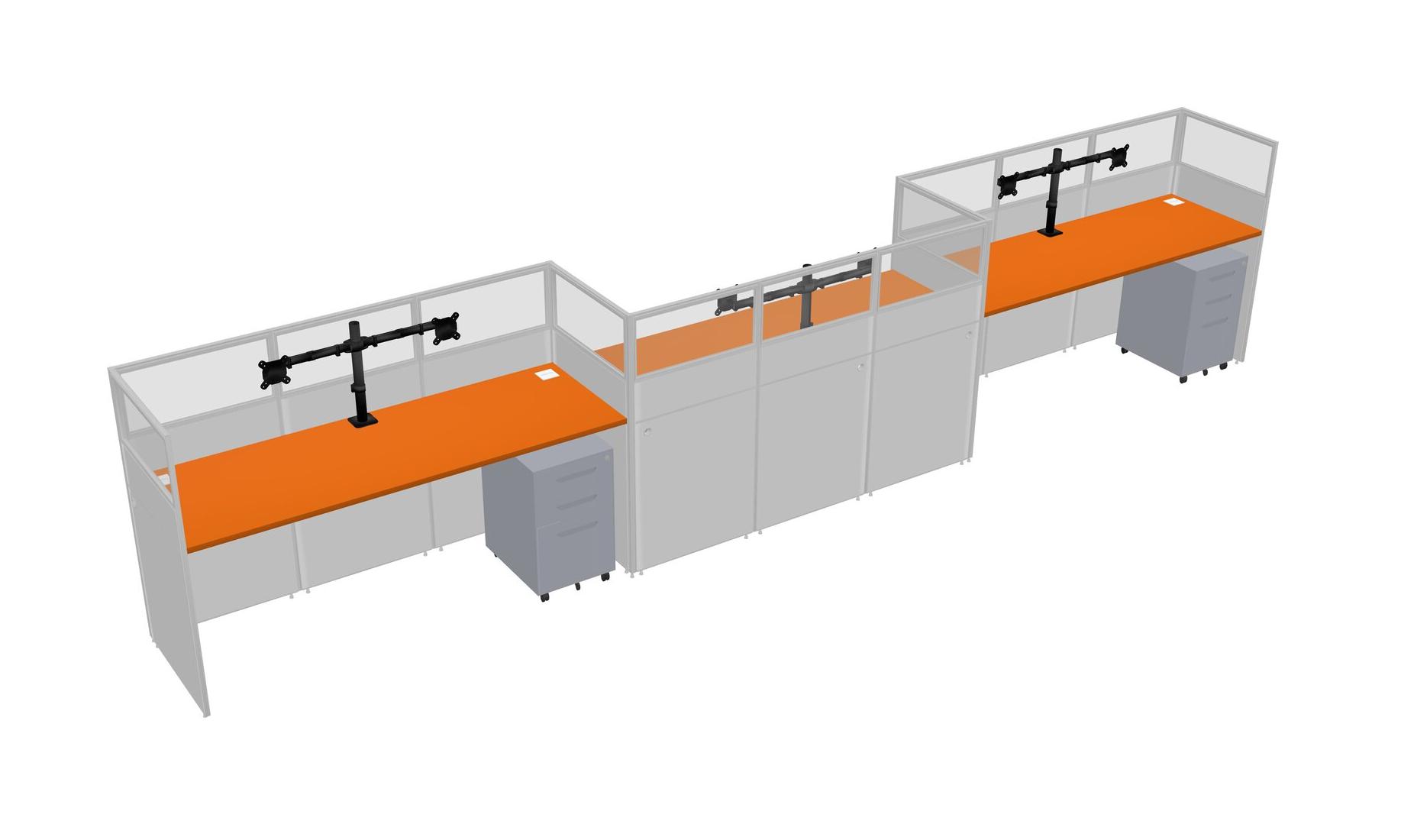Orange Rectangular Cubicle Workstations For 3 - Zigzag Formation + Grey Metal Mobile Drawers