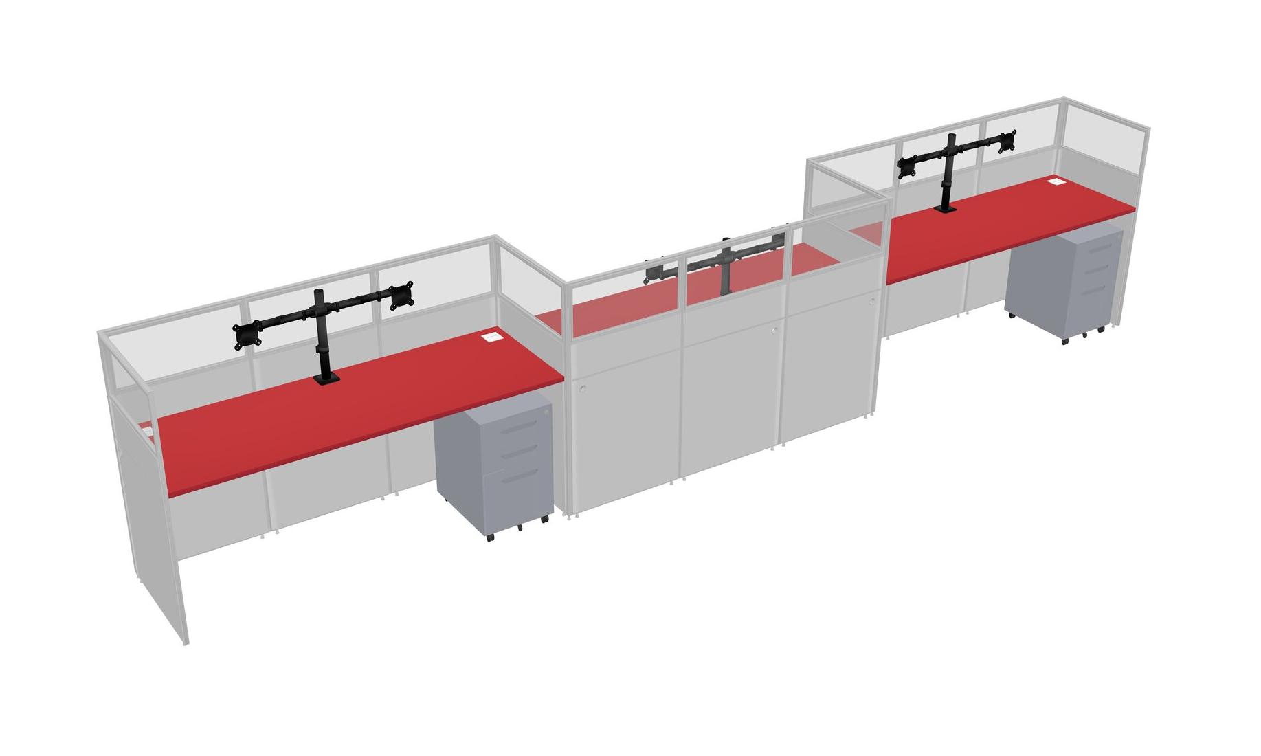 Prism Red Rectangular Cubicle Workstations For 3 - Zigzag Formation + Grey Metal Mobile Drawers